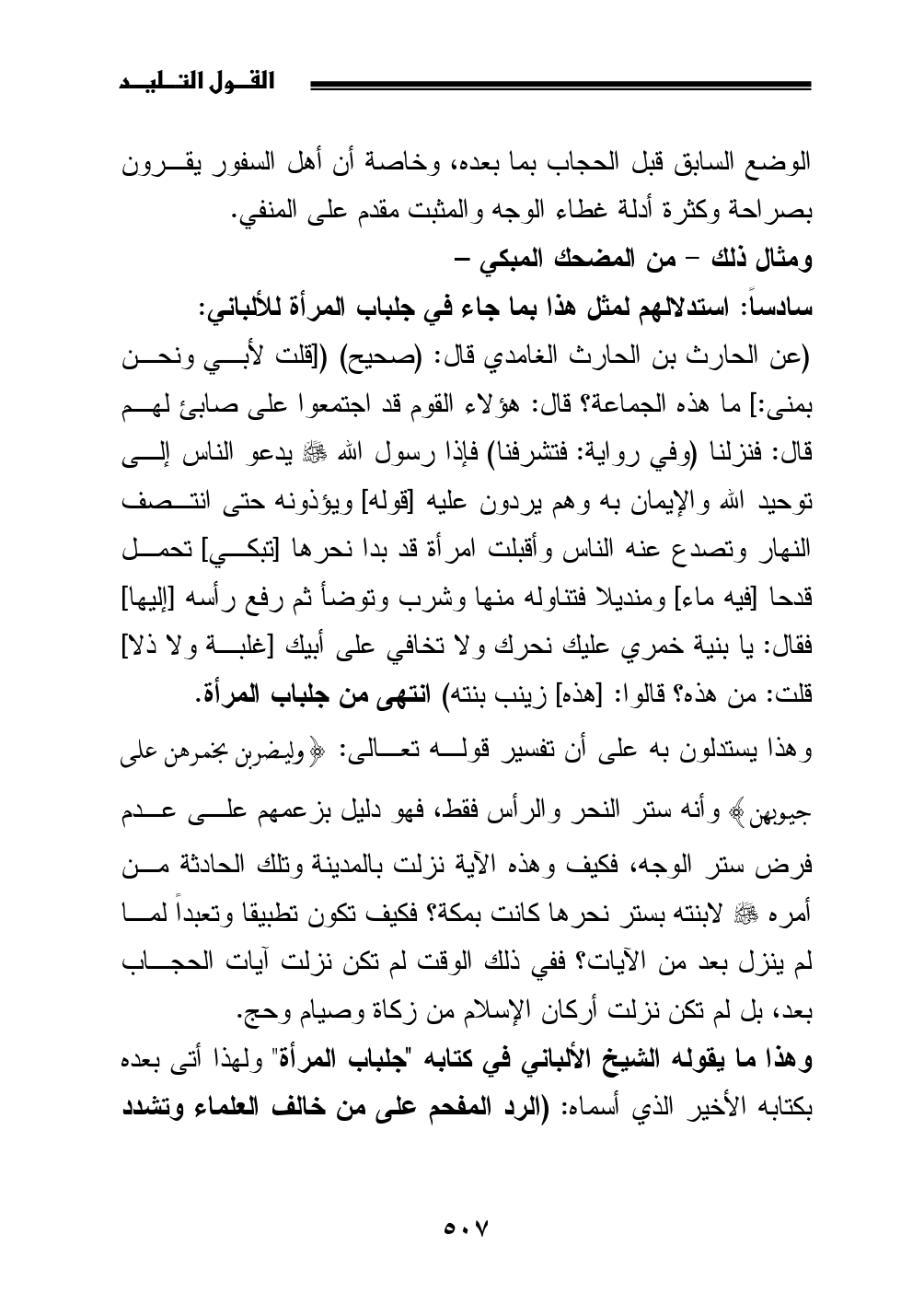 سادساً: استدلالهم لمثل هذا بما جاء في جلباب المرأة للألباني: