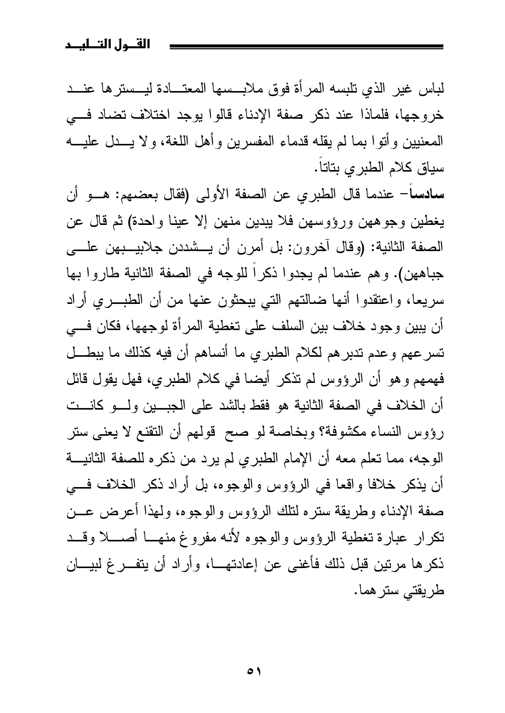 سادساً- عندما قال الطبري عن الصفة الأولى (فقال بعضهم: هو أن يغطين وجوههن ورؤوسهن فلا يبدين منهن إلا عينا واحدة) ثم قال عن الصفة الثانية: (وقال آخرون: بل أمرن أن يشددن جلابيبهن على جباههن). وهم عندما لم يجدوا ذكراً للوجه في الصفة الثانية طاروا بها سريعا، واعتقدوا أنها ضالتهم التي يبحثون عنها من أن الطبري أراد أن يبين وجود خلاف بين السلف على تغطية المرأة لوجهها، فكان في تسرعهم وعدم تدبرهم لكلام الطبري ما أنساهم أن فيه كذلك ما يبطل فهمهم وهو أن الرؤوس لم تذكر أيضا في كلام الطبري، فهل يقول قائل أن الخلاف في الصفة الثانية هو فقط بالشد على الجبين ولو كانت رؤوس النساء مكشوفة؟ وبخاصة لو صح قولهم أن التقنع لا يعنى ستر الوجه، مما تعلم معه أن الإمام الطبري لم يرد من ذكره للصفة الثانية أن يذكر خلافا واقعا في الرؤوس والوجوه، بل أراد ذكر الخلاف في صفة الإدناء وطريقة ستره لتلك الرؤوس والوجوه، ولهذا أعرض عن تكرار عبارة تغطية الرؤوس والوجوه لأنه مفروغ منها أصلا وقد ذكرها مرتين قبل ذلك فأغنى عن إعادتها، وأراد أن يتفرغ لبيان طريقتي سترهما.