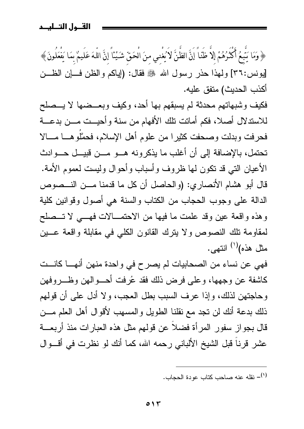 قال أبو هشام الأنصاري: (والحاصل أن كل ما قدمنا من النصوص الدالة على وجوب الحجاب من الكتاب والسنة هي أصول وقوانين كلية وهذه واقعة عين وقد علمت ما فيها من الاحتمالات فهي لا تصلح لمقاومة تلك النصوص ولا يترك القانون الكلي في مقابلة واقعة عين مثل هذه) (¬1) انتهى.