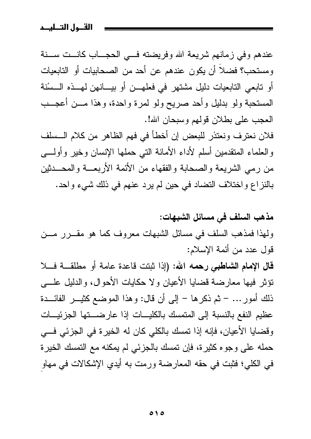 ولهذا فمذهب السلف في مسائل الشبهات معروف كما هو مقرر من قول عدد من أئمة الإسلام:
