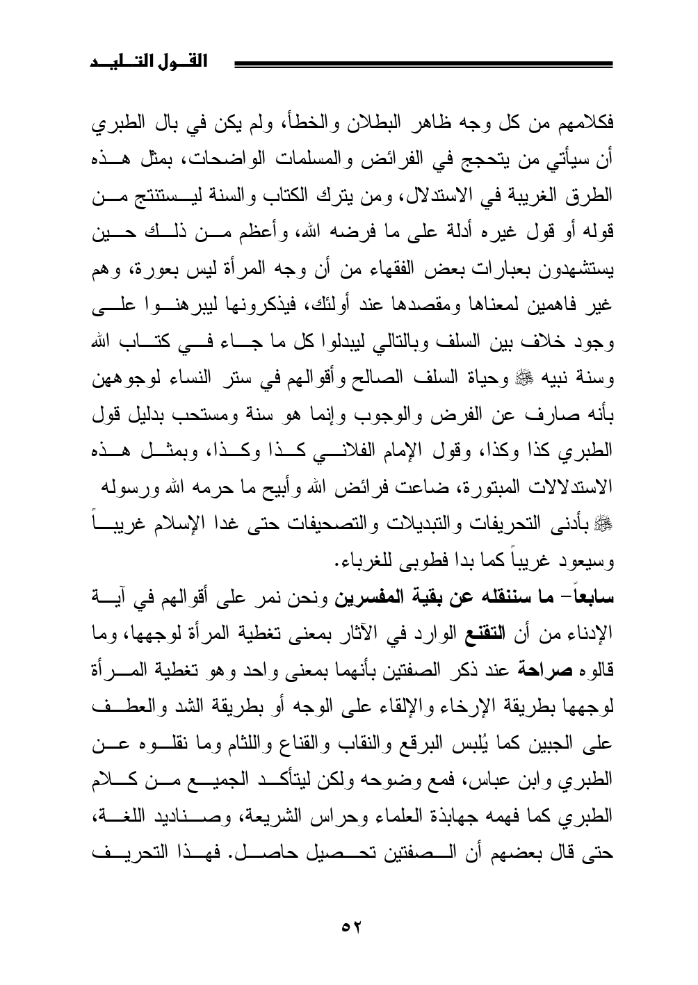 سابعاً- ما سننقله عن بقية المفسرين ونحن نمر على أقوالهم في آية الإدناء من أن التقنع الوارد في الآثار بمعنى تغطية المرأة لوجهها، وما قالوه صراحة عند ذكر الصفتين بأنهما بمعنى واحد وهو تغطية المرأة لوجهها بطريقة الإرخاء والإلقاء على الوجه أو بطريقة الشد والعطف على الجبين كما يُلبس البرقع والنقاب والقناع واللثام وما نقلوه عن الطبري وابن عباس، فمع وضوحه ولكن ليتأكد الجميع من كلام الطبري كما فهمه جهابذة العلماء وحراس الشريعة، وصناديد اللغة، حتى قال بعضهم أن الصفتين تحصيل حاصل. فهذا التحريف