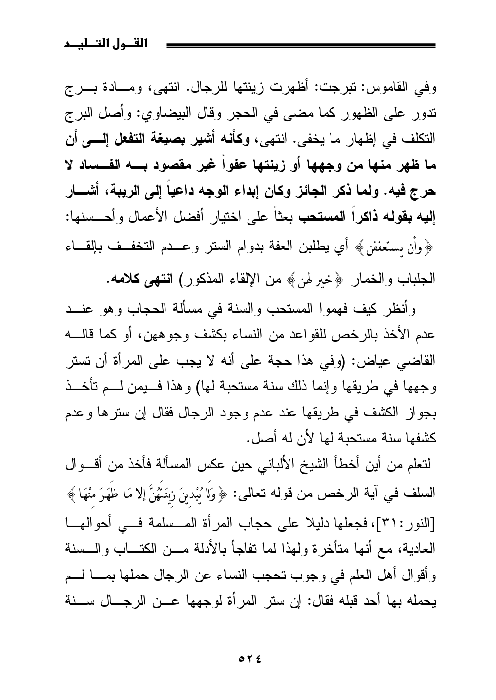 لتعلم من أين أخطأ الشيخ الألباني حين عكس المسألة فأخذ من أقوال السلف في آية الرخص من قوله تعالى: {وَلَا يُبْدِينَ زِينَتَهُنَّ إلا مَا ظَهَرَ مِنْهَا} [النور: 31]، فجعلها دليلا على حجاب المرأة المسلمة في أحوالها العادية، مع أنها متأخرة ولهذا لما تفاجأ بالأدلة من الكتاب والسنة وأقوال أهل العلم في وجوب تحجب النساء عن الرجال حملها بما لم يحمله بها أحد قبله فقال: إن ستر المرأة لوجهها عن الرجال سنة