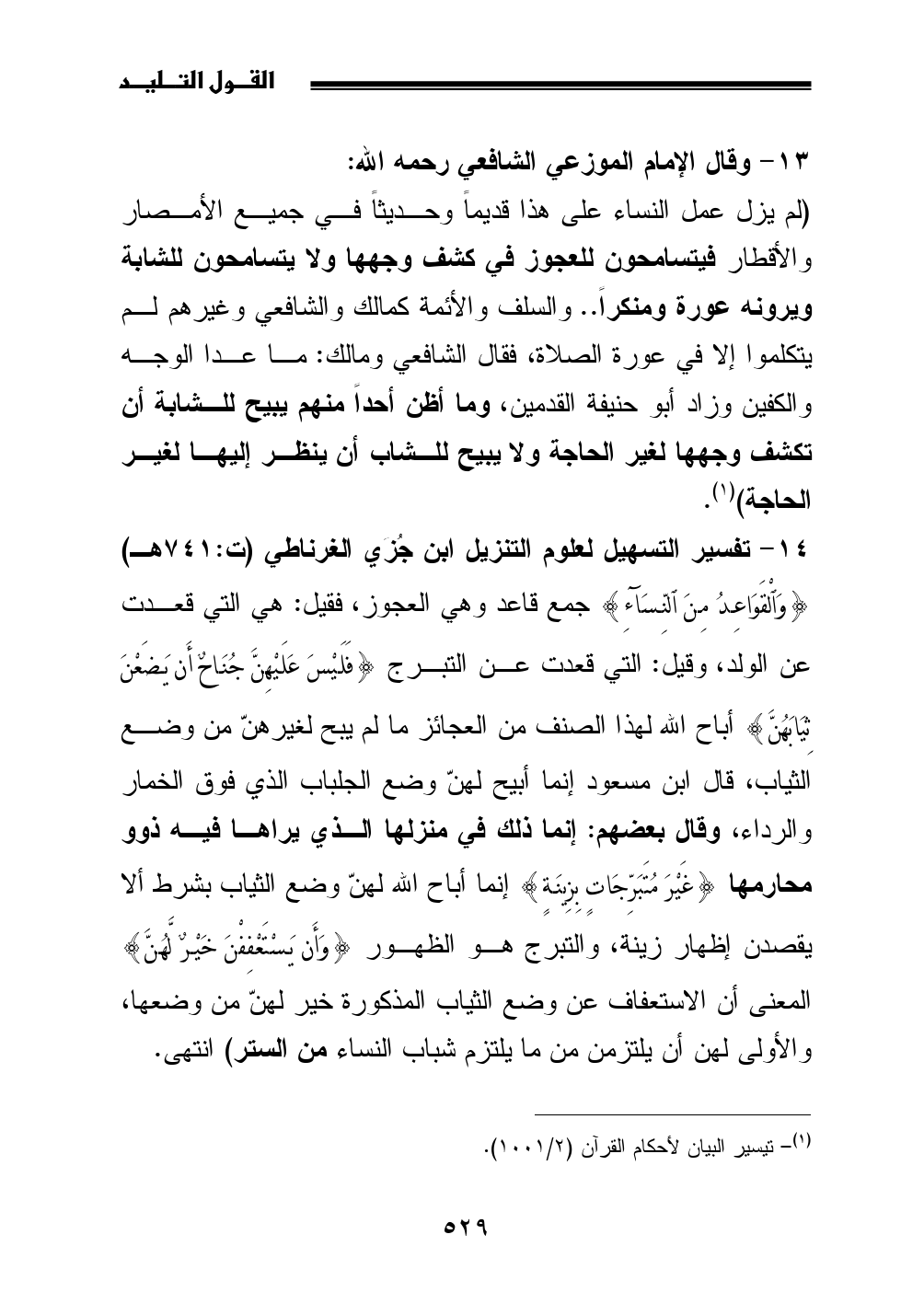 14 - تفسير التسهيل لعلوم التنزيل ابن جُزَي الغرناطي (ت: 741 هـ) {وَالْقَوَاعِدُ مِنَ النِّسَآءِ} جمع قاعد وهي العجوز، فقيل: هي التي قعدت عن الولد، وقيل: التي قعدت عن التبرج {فَلَيْسَ عَلَيْهِنَّ جُنَاحٌ أَن يَضَعْنَ ثِيَابَهُنَّ} أباح الله لهذا الصنف من العجائز ما لم يبح لغيرهنّ من وضع الثياب، قال ابن مسعود إنما أبيح لهنّ وضع الجلباب الذي فوق الخمار والرداء، وقال بعضهم: إنما ذلك في منزلها الذي يراها فيه ذوو محارمها {غَيْرَ مُتَبَرِّجَاتٍ بِزِينَةٍ} إنما أباح الله لهنّ وضع الثياب بشرط ألا يقصدن إظهار زينة، والتبرج هو الظهور {وَأَن يَسْتَعْفِفْنَ خَيْرٌ لَّهُنَّ} المعنى أن الاستعفاف عن وضع الثياب المذكورة خير لهنّ من وضعها، والأولى لهن أن يلتزمن من ما يلتزم شباب النساء من الستر) انتهى.