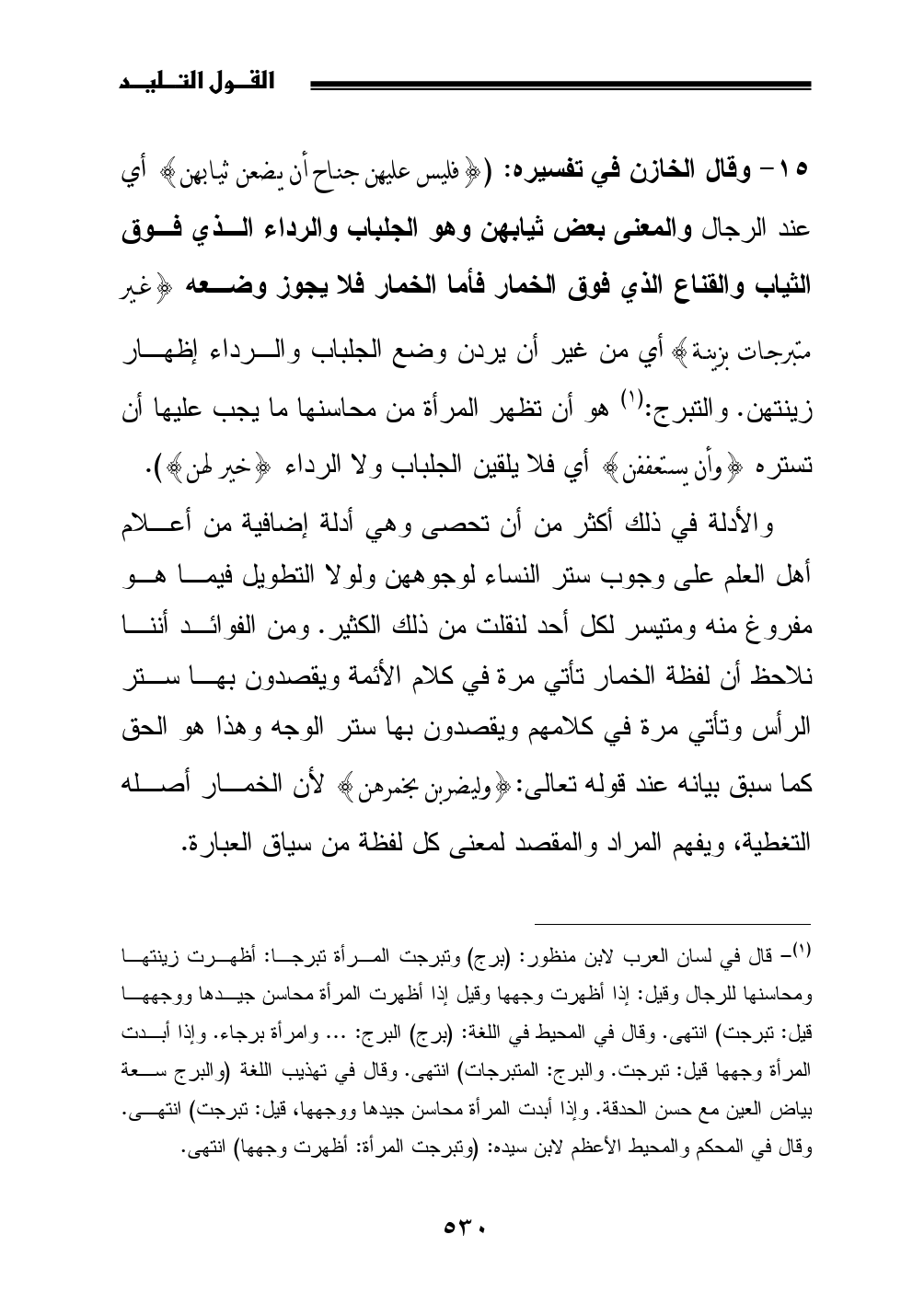 15 - وقال الخازن في تفسيره: ({فليس عليهن جناح أن يضعن ثيابهن} أي عند الرجال والمعنى بعض ثيابهن وهو الجلباب والرداء الذي فوق الثياب والقناع الذي فوق الخمار فأما الخمار فلا يجوز وضعه {غير متبرجات بزينة} أي من غير أن يردن وضع الجلباب والرداء إظهار زينتهن. والتبرج: (¬1) هو أن تظهر المرأة من محاسنها ما يجب عليها أن تستره {وأن يستعففن} أي فلا يلقين الجلباب ولا الرداء {خير لهن}).