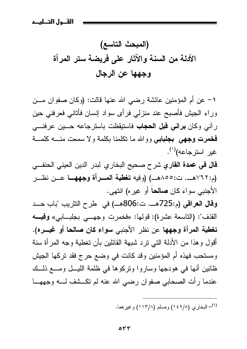 وقال العراقي (م: 725 هـ. ت: 806 هـ) في طرح التثريب "باب حد القذف": (التاسعة عشرة): قولها: «فخمرت وجهي بجلبابي» وفيه تغطية المرأة وجهها عن نظر الأجنبي سواء كان صالحا أو غيره). أقول وهذا من الأدلة التي ترد شبهة القائلين بأن تغطية وجه المرأة سنة ومستحب فهذه أم المؤمنين وقد كانت في وضع حرج فقد تركها الجيش ظانين أنها في هودجها وساروا وتركوها في ظلمة الليل ومع ذلك عندما رأت الصحابي صفوان رضي الله عنه لم تكشف له وجهها