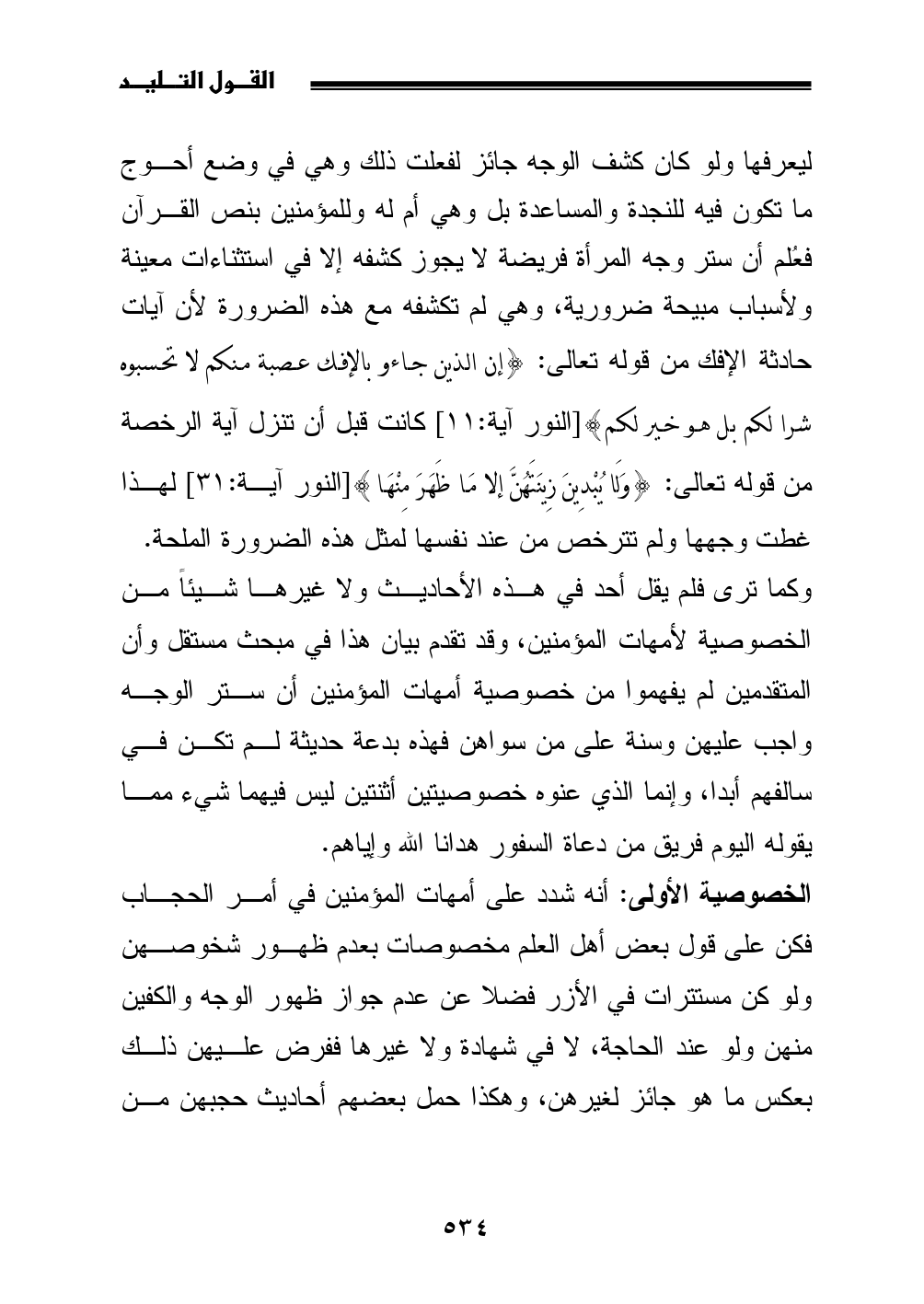 وكما ترى فلم يقل أحد في هذه الأحاديث ولا غيرها شيئاً من الخصوصية لأمهات المؤمنين، وقد تقدم بيان هذا في مبحث مستقل وأن المتقدمين لم يفهموا من خصوصية أمهات المؤمنين أن ستر الوجه واجب عليهن وسنة على من سواهن فهذه بدعة حديثة لم تكن في سالفهم أبدا، وإنما الذي عنوه خصوصيتين أثنتين ليس فيهما شيء مما يقوله اليوم فريق من دعاة السفور هدانا الله وإياهم.
