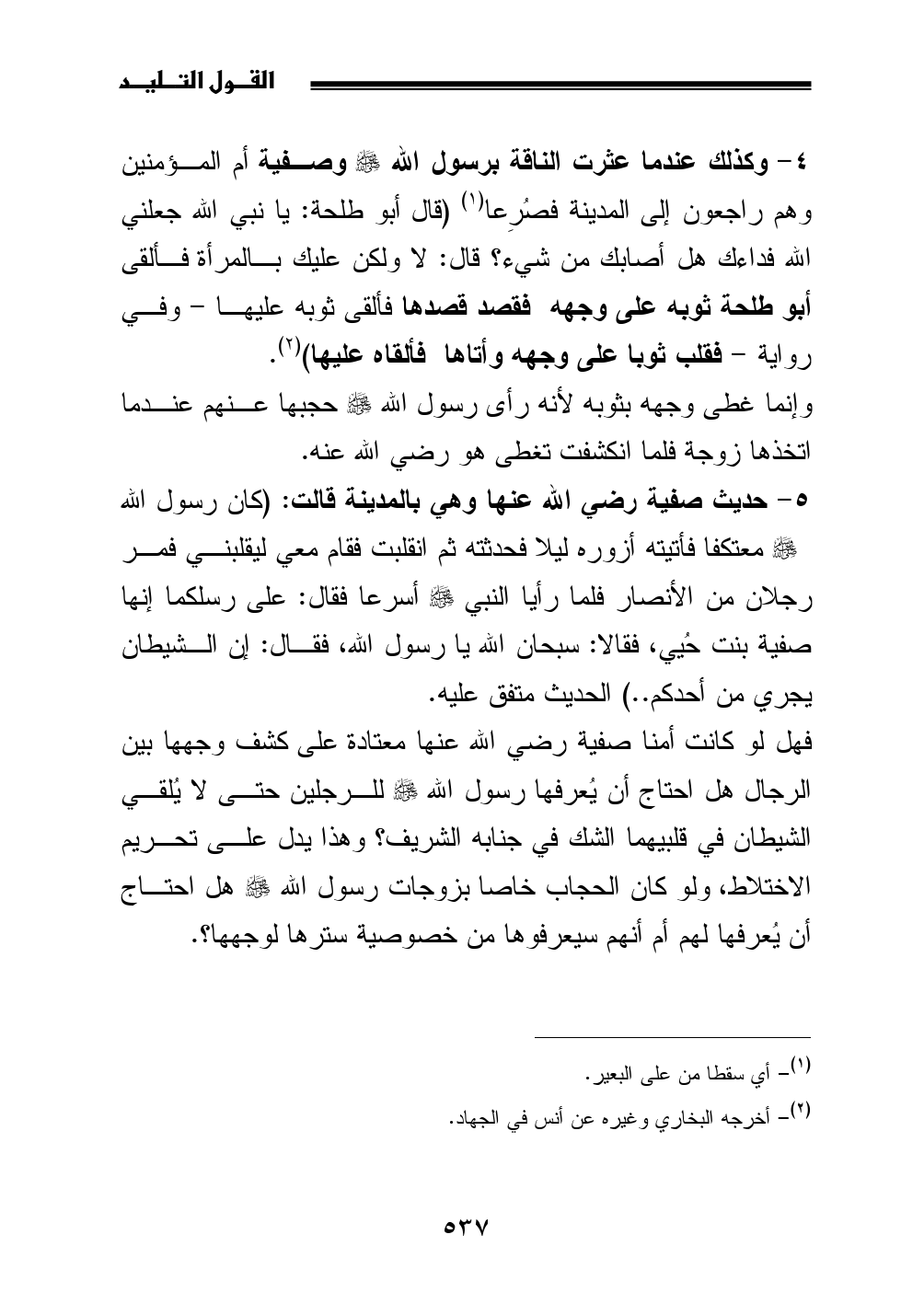 فهل لو كانت أمنا صفية رضي الله عنها معتادة على كشف وجهها بين الرجال هل احتاج أن يُعرفها رسول الله - صلى الله عليه وسلم - للرجلين حتى لا يُلقي الشيطان في قلبيهما الشك في جنابه الشريف؟ وهذا يدل على تحريم الاختلاط، ولو كان الحجاب خاصا بزوجات رسول الله - صلى الله عليه وسلم - هل احتاج أن يُعرفها لهم أم أنهم سيعرفوها من خصوصية سترها لوجهها؟ .