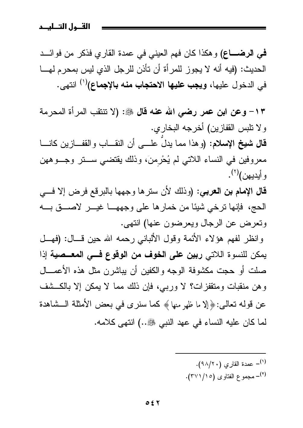 وانظر لفهم هؤلاء الأئمة وقول الألباني رحمه الله حين قال: (فهل يمكن للنسوة اللاتي ربين على الخوف من الوقوع في المعصية إذا صلت أو حجت مكشوفة الوجه والكفين أن يباشرن مثل هذه الأعمال وهن منقبات ومتقفزات؟ لا وربي، فإن ذلك مما لا يمكن إلا بالكشف عن قوله تعالى: {إلا ما ظهر منها} كما سنرى في بعض الأمثلة الشاهدة لما كان عليه النساء في عهد النبي - صلى الله عليه وسلم - .. ) انتهى كلامه.