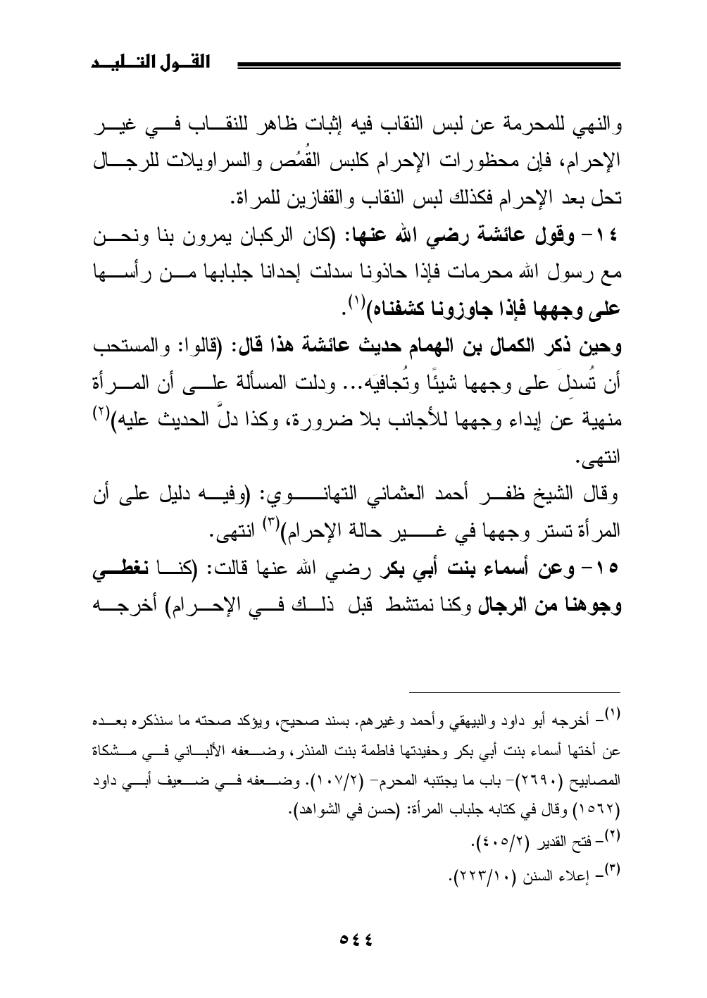 14 - وقول عائشة رضي الله عنها: (كان الركبان يمرون بنا ونحن مع رسول الله محرمات فإذا حاذونا سدلت إحدانا جلبابها من رأسها على وجهها فإذا جاوزونا كشفناه) (¬1).