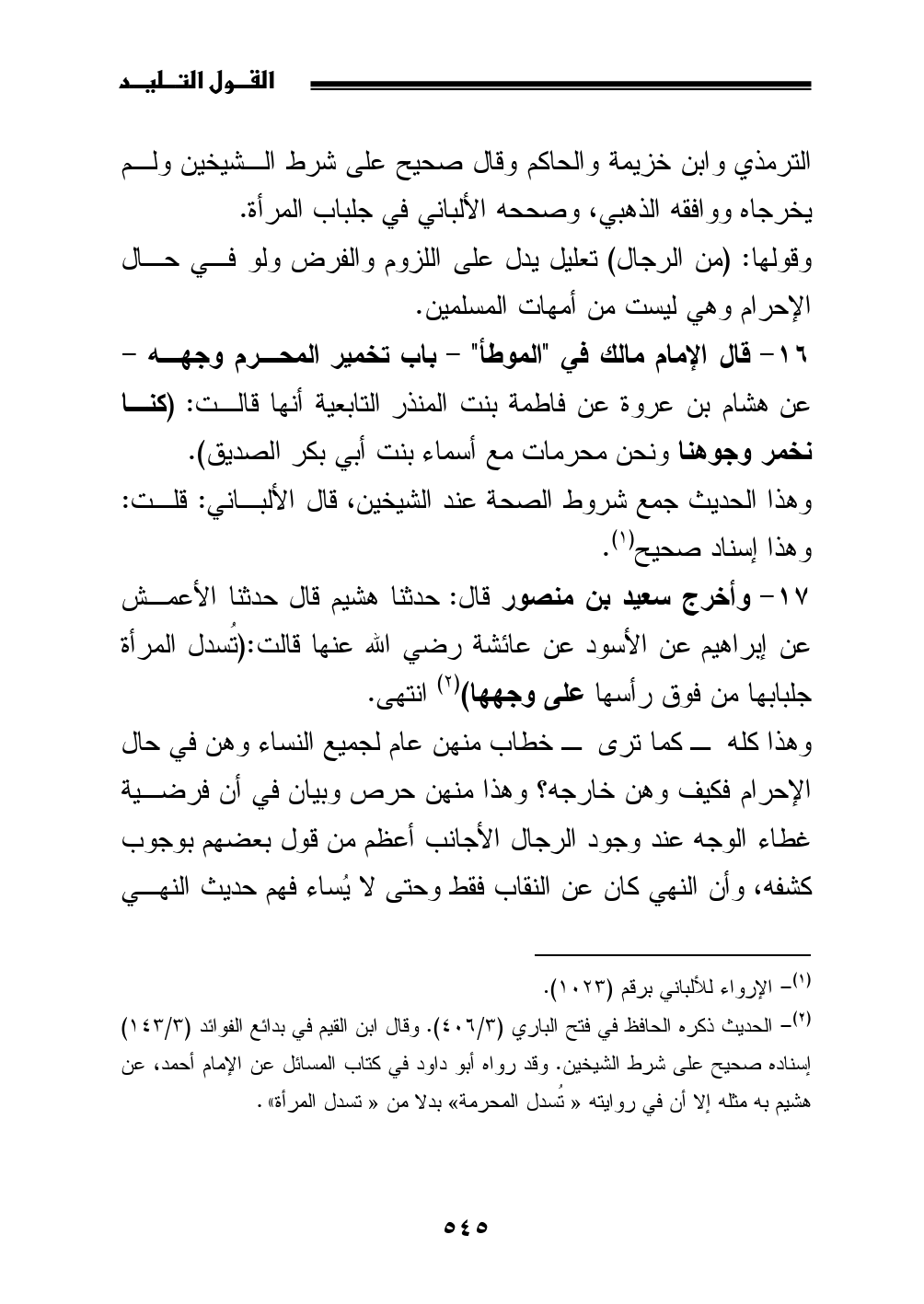 (¬2) الحديث ذكره الحافظ في فتح الباري (3/ 406). وقال ابن القيم في بدائع الفوائد (3/ 143) إسناده صحيح على شرط الشيخين. وقد رواه أبو داود في كتاب المسائل عن الإمام أحمد، عن هشيم به مثله إلا أن في روايته «تُسدل المحرمة» بدلا من «تسدل المرأة «.
