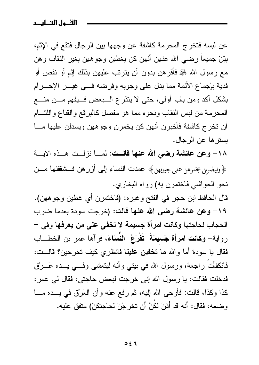 عن لبسه فتخرج المحرمة كاشفة عن وجهها بين الرجال فتقع في الإثم، بيّنَّ جميعاً رضي الله عنهن أنهن كن يغطين وجوههن بغير النقاب وهن مع رسول الله - صلى الله عليه وسلم - فأقرهن بدون أن يترتب عليهن بذلك إثم أو نقص أو فدية بإجماع الأئمة مما يدل على وجوبه وفرضه في غير الإحرام بشكل آكد ومن باب أولى، حتى لا يتذرع البعض فيفهم من منع المحرمة من لبس النقاب ونحوه مما هو مفصل كالبرقع والقناع واللثام أن تخرج كاشفة فأخبرن أنهن كن يخمرن وجوههن ويسدلن عليها ما يسترها عن الرجال.