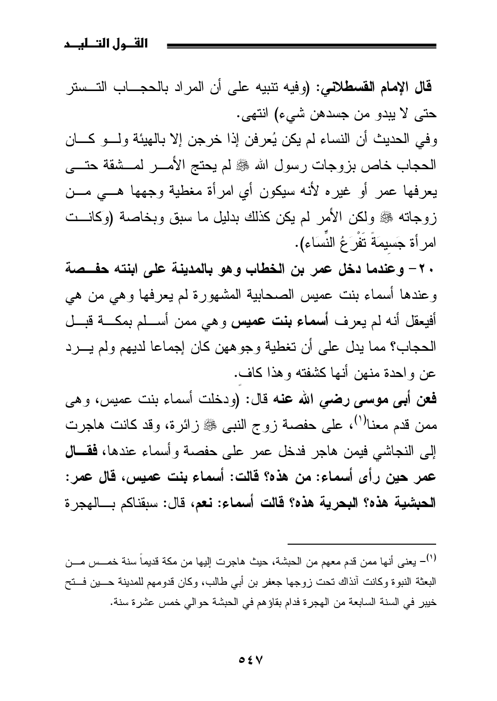 20 - وعندما دخل عمر بن الخطاب وهو بالمدينة على ابنته حفصة وعندها أسماء بنت عميس الصحابية المشهورة لم يعرفها وهي من هي أفيعقل أنه لم يعرف أسماء بنت عميس وهي ممن أسلم بمكة قبل الحجاب؟ مما يدل على أن تغطية وجوههن كان إجماعا لديهم ولم يرد عن واحدة منهن أنها كشفته وهذا كافٍ.