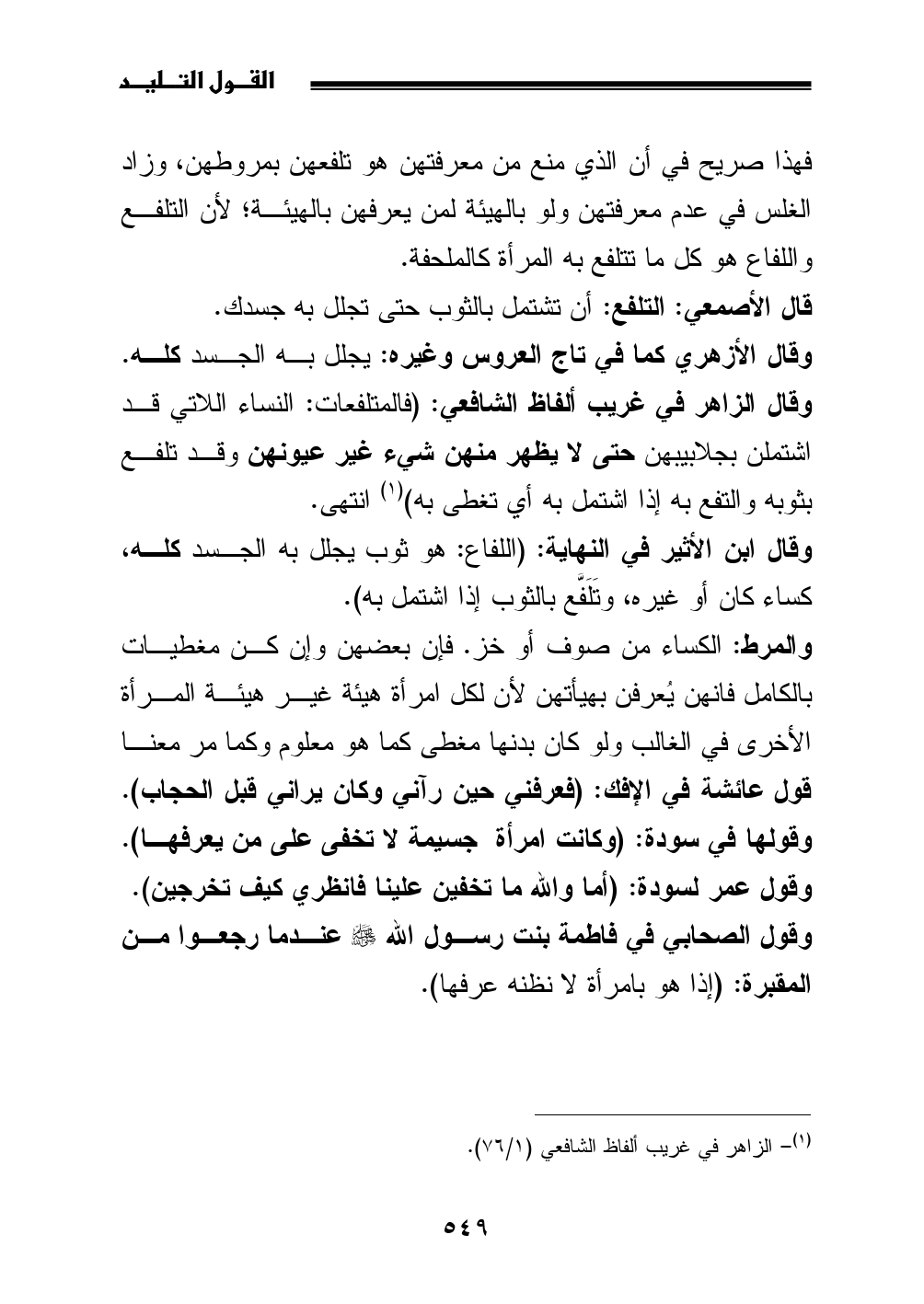 وقال الأزهري كما في تاج العروس وغيره: يجلل به الجسد كله. وقال الزاهر في غريب ألفاظ الشافعي: (فالمتلفعات: النساء اللاتي قد اشتملن بجلابيبهن حتى لا يظهر منهن شيء غير عيونهن وقد تلفع بثوبه والتفع به إذا اشتمل به أي تغطى به) (¬1) انتهى.