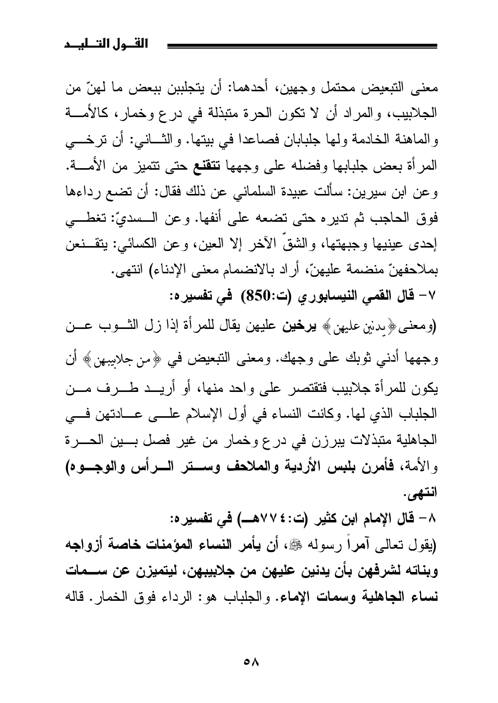 (يقول تعالى آمراً رسوله - صلى الله عليه وسلم -، أن يأمر النساء المؤمنات خاصة أزواجه وبناته لشرفهن بأن يدنين عليهن من جلابيبهن، ليتميزن عن سمات نساء الجاهلية وسمات الإماء. والجلباب هو: الرداء فوق الخمار. قاله