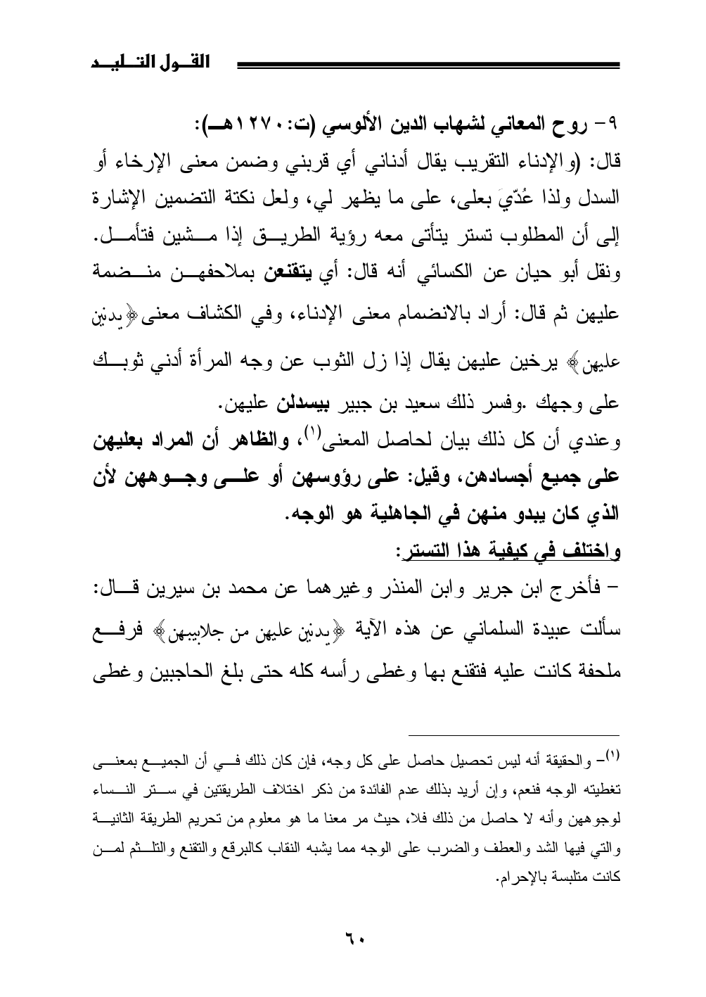 ونقل أبو حيان عن الكسائي أنه قال: أي يتقنعن بملاحفهن منضمة عليهن ثم قال: أراد بالانضمام معنى الإدناء، وفي الكشاف معنى {يدنين عليهن} يرخين عليهن يقال إذا زل الثوب عن وجه المرأة أدني ثوبك على وجهك. وفسر ذلك سعيد بن جبير بيسدلن عليهن.