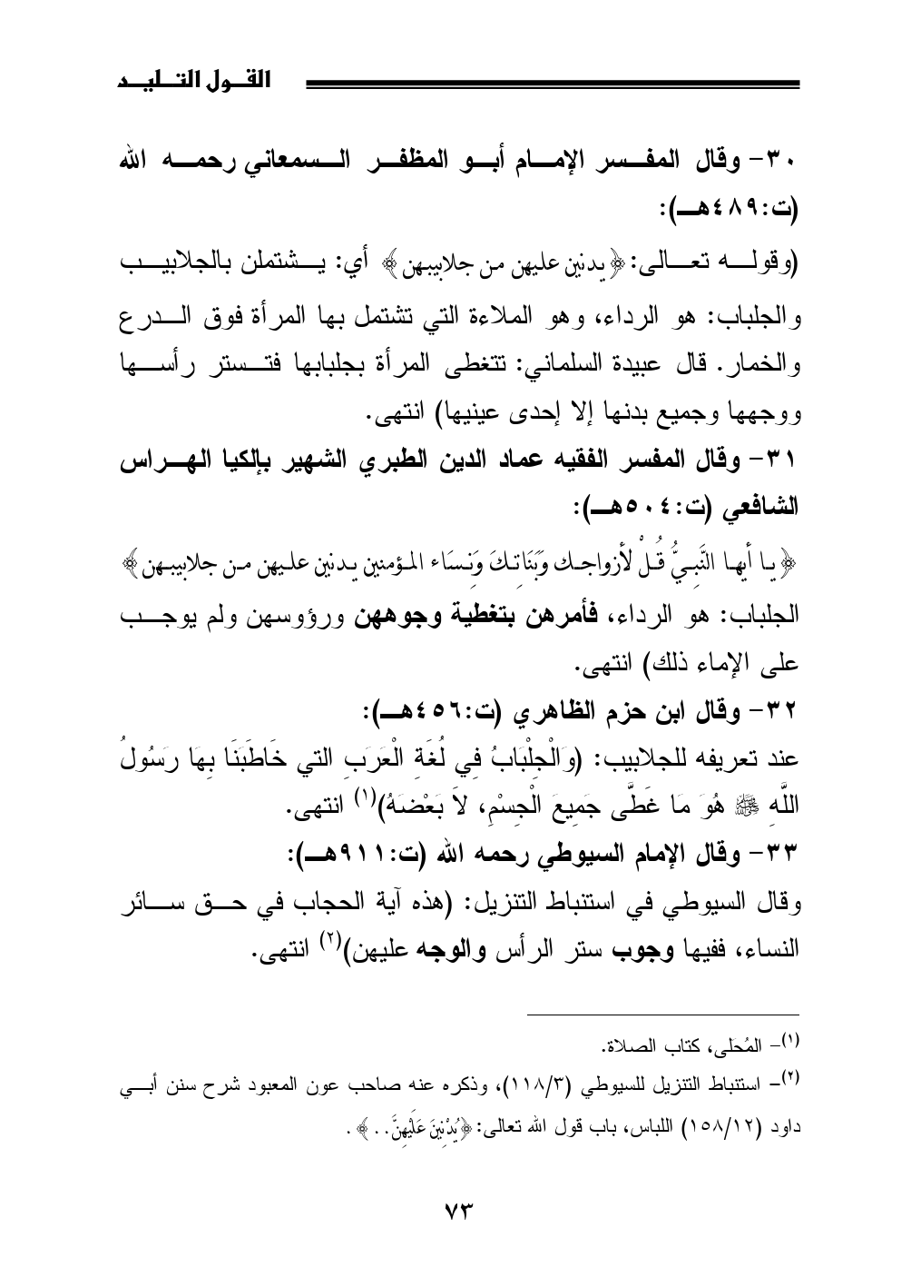 (¬2) استنباط التنزيل للسيوطي (3/ 118)، وذكره عنه صاحب عون المعبود شرح سنن أبي داود (12/ 158) اللباس، باب قول الله تعالى: {يُدْنِينَ عَلَيْهِنَّ .. }.