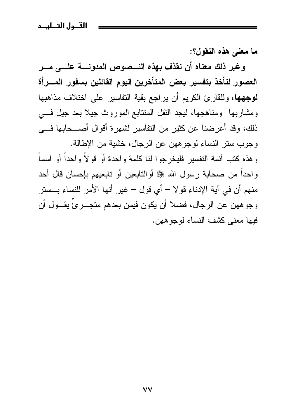وغير ذلك معناه أن نقذف بهذه النصوص المدونة على مر العصور لنأخذ بتفسير بعض المتأخرين اليوم القائلين بسفور المرأة لوجهها، وللقارئ الكريم أن يراجع بقية التفاسير على اختلاف مذاهبها ومشاربها ومناهجها، ليجد النقل المتتابع الموروث جيلا بعد جيل في ذلك، وقد أعرضنا عن كثير من التفاسير لشهرة أقوال أصحابها في وجوب ستر النساء لوجوههن عن الرجال، خشية من الإطالة.