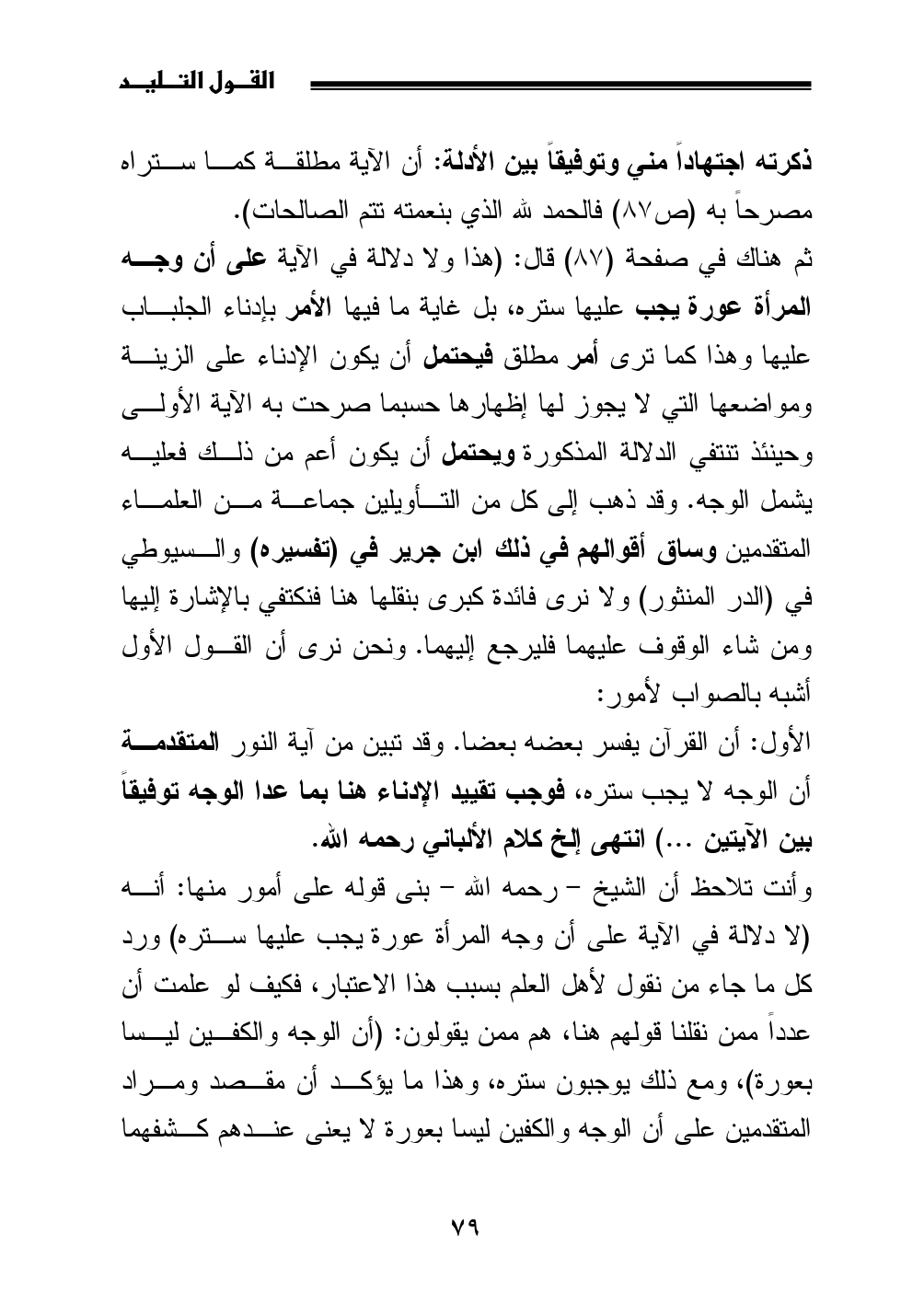 ثم هناك في صفحة (87) قال: (هذا ولا دلالة في الآية على أن وجه المرأة عورة يجب عليها ستره، بل غاية ما فيها الأمر بإدناء الجلباب عليها وهذا كما ترى أمر مطلق فيحتمل أن يكون الإدناء على الزينة ومواضعها التي لا يجوز لها إظهارها حسبما صرحت به الآية الأولى وحينئذ تنتفي الدلالة المذكورة ويحتمل أن يكون أعم من ذلك فعليه يشمل الوجه. وقد ذهب إلى كل من التأويلين جماعة من العلماء المتقدمين وساق أقوالهم في ذلك ابن جرير في (تفسيره) والسيوطي في (الدر المنثور) ولا نرى فائدة كبرى بنقلها هنا فنكتفي بالإشارة إليها ومن شاء الوقوف عليهما فليرجع إليهما. ونحن نرى أن القول الأول أشبه بالصواب لأمور: