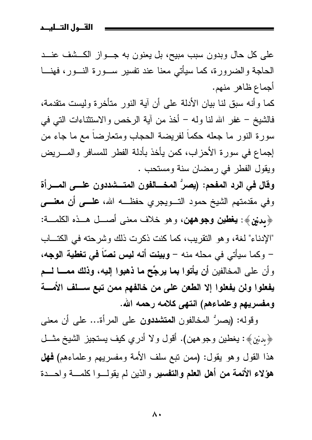 وقال في الرد المفحم: (يصرُّ المخالفون المتشددون على المرأة وفي مقدمتهم الشيخ حمود التويجري حفظه الله، على أن معنى {يدنين}: يغطين وجوههن، وهو خلاف معنى أصل هذه الكلمة: "الإدناء" لغة، وهو التقريب، كما كنت ذكرت ذلك وشرحته في الكتاب - وكما سيأتي في محله منه - وبينت أنه ليس نصّاً في تغطية الوجه، وأن على المخالفين أن يأتوا بما يرجِّح ما ذهبوا إليه، وذلك مما لم يفعلوا ولن يفعلوا إلا الطعن على من خالفهم ممن تبع سلف الأمة ومفسريهم وعلماءهم) انتهى كلامه رحمه الله.