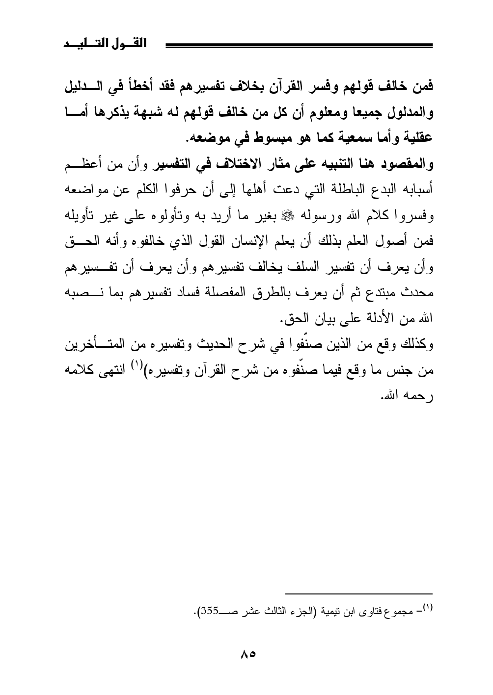 والمقصود هنا التنبيه على مثار الاختلاف في التفسير وأن من أعظم أسبابه البدع الباطلة التي دعت أهلها إلى أن حرفوا الكلم عن مواضعه وفسروا كلام الله ورسوله - صلى الله عليه وسلم - بغير ما أريد به وتأولوه على غير تأويله فمن أصول العلم بذلك أن يعلم الإنسان القول الذي خالفوه وأنه الحق وأن يعرف أن تفسير السلف يخالف تفسيرهم وأن يعرف أن تفسيرهم محدث مبتدع ثم أن يعرف بالطرق المفصلة فساد تفسيرهم بما نصبه الله من الأدلة على بيان الحق.