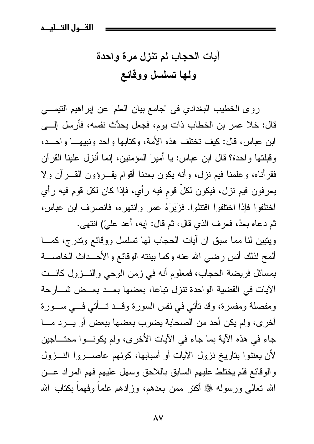 ويتبين لنا مما سبق أن آيات الحجاب لها تسلسل ووقائع وتدرج، كما ألمح لذلك أنس رضي الله عنه وكما بينته الوقائع والأحداث الخاصة بمسائل فريضة الحجاب، فمعلوم أنه في زمن الوحي والنزول كانت الآيات في القضية الواحدة تنزل تباعا، بعضها بعد بعض شارحة ومفصلة ومفسرة، وقد تأتي في نفس السورة وقد تأتي في سورة أخرى، ولم يكن أحد من الصحابة يضرب بعضها ببعض أو يرد ما جاء في هذه الآية بما جاء في الآيات الأخرى، ولم يكونوا محتاجين لأن يعتنوا بتاريخ نزول الآيات أو أسبابها، كونهم عاصروا النزول والوقائع فلم يختلط عليهم السابق باللاحق وسهل عليهم فهم المراد عن الله تعالى ورسوله - صلى الله عليه وسلم - أكثر ممن بعدهم، وزادهم علماً وفهماً بكتاب الله