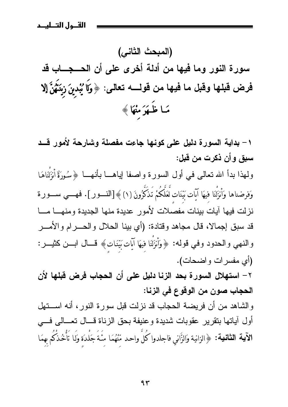 سورة النور وما فيها من أدلة أخرى على أن الحجاب قد فرض قبلها وقبل ما فيها من قوله تعالى: {وَلَا يُبْدِينَ زِينَتَهُنَّ إلا مَا ظَهَرَ مِنْهَا}