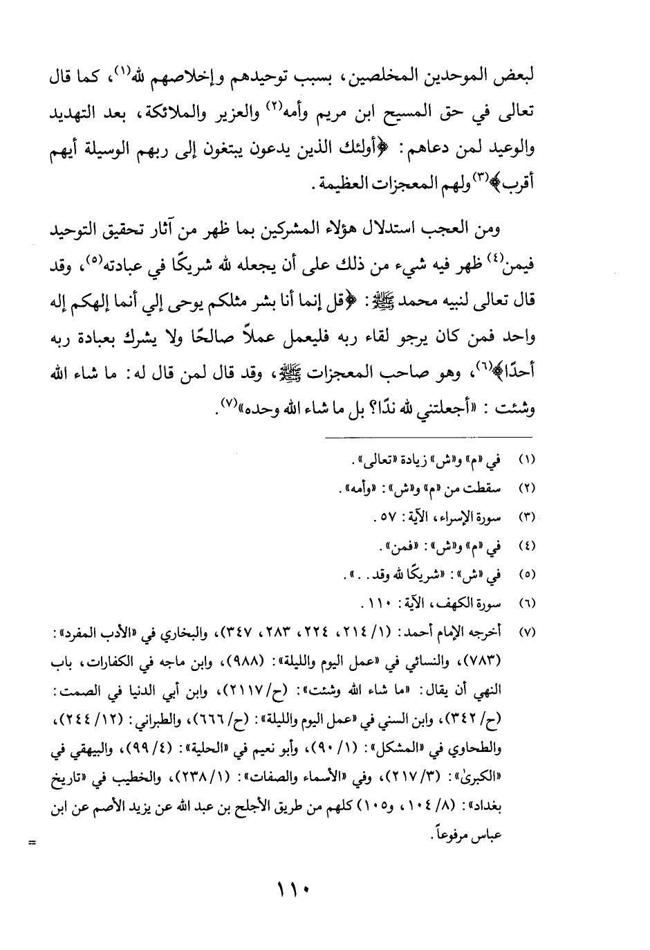 ومن العجب استدلال هؤلاء المشركين بما ظهر من آثار تحقيق التوحيد فيمن (4) ظهر فيه شيء من ذلك على أن يجعله لله شريكاً في عبادته (5) ، وقد قال تعالى لنبيه محمد صلى الله عليه وسلم: {قُلْ إِنَّمَا أَنَا بَشَرٌ مِثْلُكُمْ يُوحَى إِلَيَّ أَنَّمَا إِلَهُكُمْ إِلَهٌ وَاحِدٌ فَمَنْ كَانَ يَرْجُوا لِقَاءَ رَبِّهِ فَلْيَعْمَلْ عَمَلاً صَالِحاً وَلا يُشْرِكْ بِعِبَادَةِ رَبِّهِ أَحَدا} (6) ، وهو صاحب المعجزات صلى الله عليه وسلم، وقد قال لمن قال له: ما شاء الله وشئت: "أجعلتني لله نداً؟ بل ما شاء الله وحده" (7) .