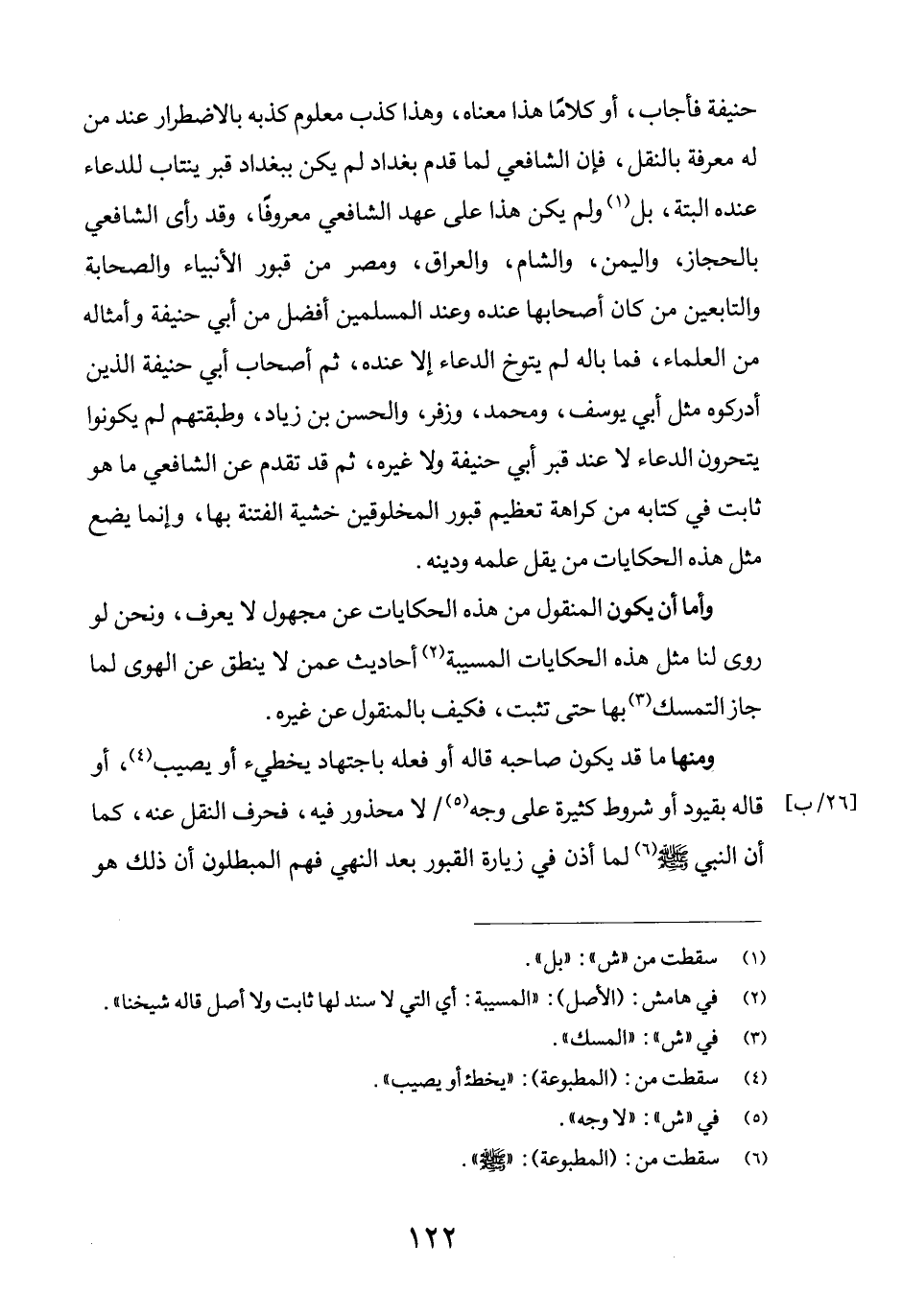 حنيفة فأجاب، أو كلاماً هذا معناه، وهذا كذب معلوم كذبه بالاضطرار عند من له معرفة بالنقل، فإن الشافعي لما قدم بغداد لم يكن ببغداد قبر ينتاب للدعاء عند البتة، بل (1) ولم يكن هذا على عهد الشافعي معروفاً، وقد رأى الشافعي بالحجاز، واليمن، والشام، والعراق، ومصر من قبور الأنبياء والصحابة والتابعين من كان أصحابها عنده وعند المسلمين أفضل من أبي حنيفة وأمثاله من العلماء، فما باله لم يتوخ الدعاء إلا عنده، ثم أصحاب أبي حنيفة الذين أدركوه مثل أبي يوسف، ومحمد، وزفر، والحسن بن زياد، وطبقتهم لم يكونوا يتحرون الدعاء لا عند قبر أبي حنيفة ولا غيره، ثم قد تقدم عن الشافعي ما هو ثابت في كتابه من كراهة تعظيم المخلوقين خشية الفتنة بها، وإنما يضع مثل هذه الحكايات من يقل علمه ودينه. وأما أن يكون المنقول من هذه الحكايات عن مجهول لا يعرف، ونحن لو روى لنا مثل هذه الحكايات المسيبة (2) أحاديث عمن لا ينطق عن الهوى لما جاز التمسك (3) بها حتى تثبت، فكيف بالمنقول عن غيره. ومنها ما قد يكون صاحبه قاله أو فعله باجتهاد يخطئ أو يصيب (4) ، أو قاله بقيود أو شروط كثيرة على وجه (5) / لا محذور فيه، فحرف النقل عنه، كما أن النبي صلى الله عليه وسلم (6) لما أذن في زيارة القبور بعد النهي فهم المبطلون أن ذلك هو