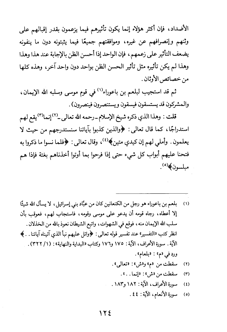 ثم قد استجيب لبلعم بن باعوراء (1) في قوم موسى وسلبه الله الإيمان، والمشركون قد يستسقون فيسقون ويستنصرون فينصرون) .