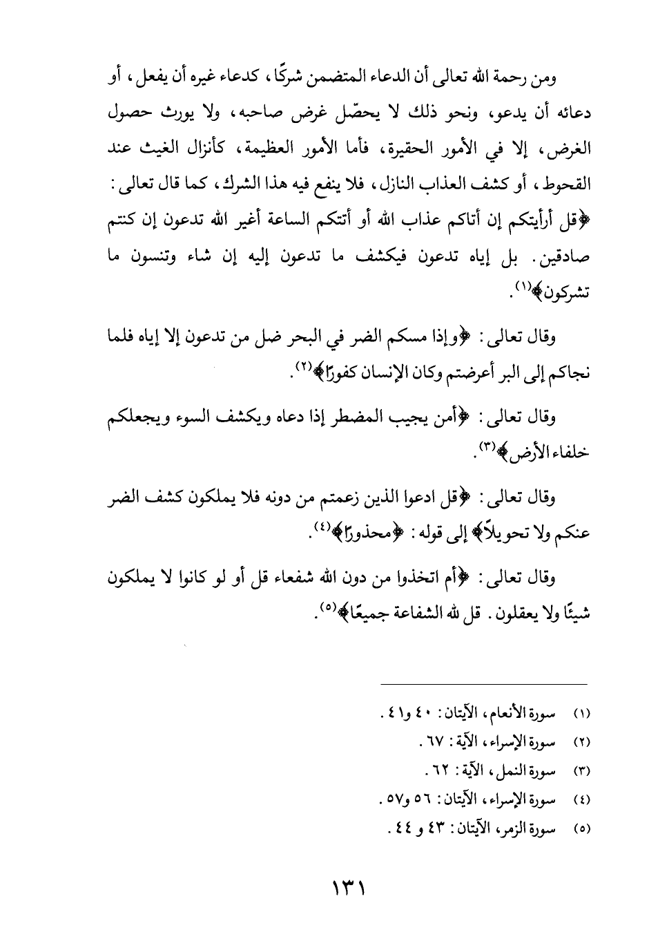 ومن رحمة الله تعالى أن الدعاء المتضمن شركاً، كدعاء غيره أن يفعل، أو دعائه أن يدعو، ونحو ذلك لا يحصّل غرض صاحبه، ولا يورث حصول الغرض، إلا في الأمور الحقيرة، فأما الأمور العظيمة، كإنزال الغيث عند القحوط، أو كشف العذاب النازل، فلا ينفع فيه هذا الشرك، كما قال تعالى: {قُلْ أَرَأَيْتَكُمْ إِنْ أَتَاكُمْ عَذَابُ اللَّهِ أَوْ أَتَتْكُمُ السَّاعَةُ أَغَيْرَ اللَّهِ تَدْعُونَ إِنْ كُنْتُمْ صَادِقِينَ، بَلْ إِيَّاهُ تَدْعُونَ فَيَكْشِفُ مَا تَدْعُونَ إِلَيْهِ إِنْ شَاءَ وَتَنْسَوْنَ مَا تُشْرِكُون} (1) .