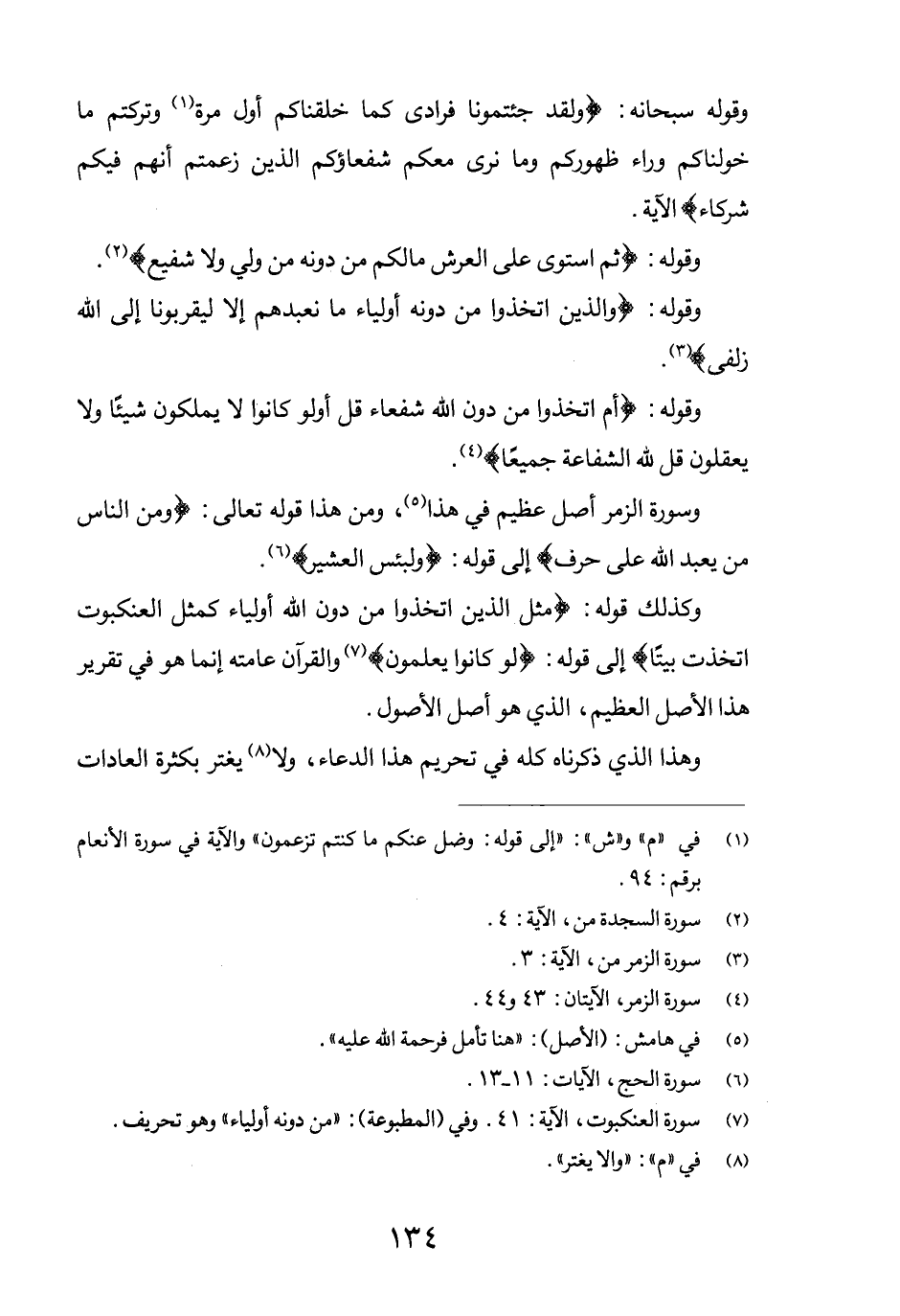 وكذلك قوله: {مَثَلُ الَّذِينَ اتَّخَذُوا مِنْ دُونِ اللَّهِ أَوْلِيَاءَ كَمَثَلِ الْعَنْكَبُوتِ اتَّخَذَتْ بَيْتاً} إلى قوله: {لَوْ كَانُوا يَعْلَمُون} (7) والقرآن عامته إنما هو في تقرير هذا الأصل العظيم، الذي هو أصل الأصول. وهذا الذي ذكرناه كله في تحريم هذا الدعاء، ولا (8) تغتر بكثرة العادات