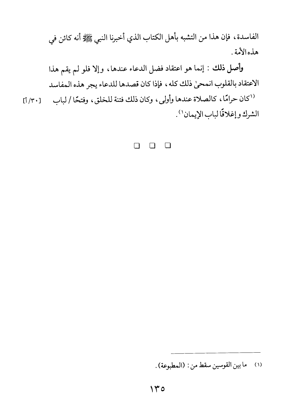 وأصل ذلك: إنما هو اعتقاد فضل الدعاء عندها، وإلا فلو لم يقم هذا الاعتقاد بالقلوب انمحى ذلك كله، فإذا كان قصدها للدعاء يجر هذه المفاسد (1 كان حراماً، كالصلاة عندها وأولى، وكان ذلك فتنة للخلق، وفتحاً/ لباب الشرك وإغلاقاً لباب الإيمان1) (1) .