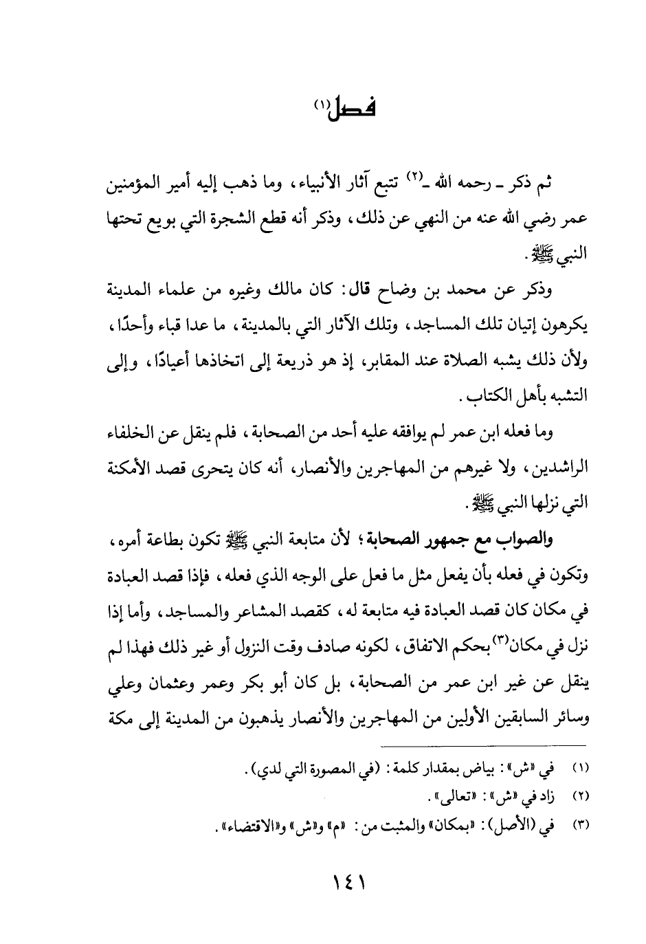ثم ذكر –رحمه الله – (2) تتبع آثار الأنبياء، وما ذهب إليه أمير المؤمنين عمر رضي الله عنه من النهي عن ذلك، وذكر أنه قطع الشجرة التي بويع تحتها النبي صلى الله عليه وسلم. وذكر عن محمد بن وضاح قال: كان مالك وغيره من علماء المدينة يكرهون إتيان تلك المساجد، وتلك الآثار التي بالمدنية، ما عدا قباء وأحداً، ولأن ذلك يشبه الصلاة عند المقابر، إذ هو ذريعة إلى اتخاذها أعياداً، وإلى التشبه بأهل الكتاب.
