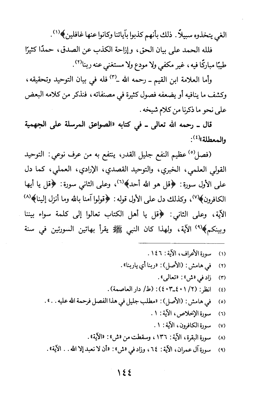 (فصل (5) عظيم النفع جليل القدر، ينتفع به من عرف نوعي: التوحيد القولي العلمي، الخبري، والتوحيد القصدي، الإرادي، العملي، كما دل على الأول سورة: {قُلْ هُوَ اللَّهُ أَحَد} (6) ، وعلى الثاني سورة: {قُلْ يَا أَيُّهَا الْكَافِرُون} (7) ، وكذلك دل على الأول قوله: {قُولُوا آمَنَّا بِاللَّهِ وَمَا أُنْزِلَ إِلَيْنَا} (8) الآية، وعلى الثاني: {قُلْ يَا أَهْلَ الْكِتَابِ تَعَالَوْا إِلَى كَلِمَةٍ سَوَاءٍ بَيْنَنَا وَبَيْنَكُم} (9) الآية، ولهذا كان النبي صلى الله عليه وسلم يقرأ بهاتين السورتين في سنة