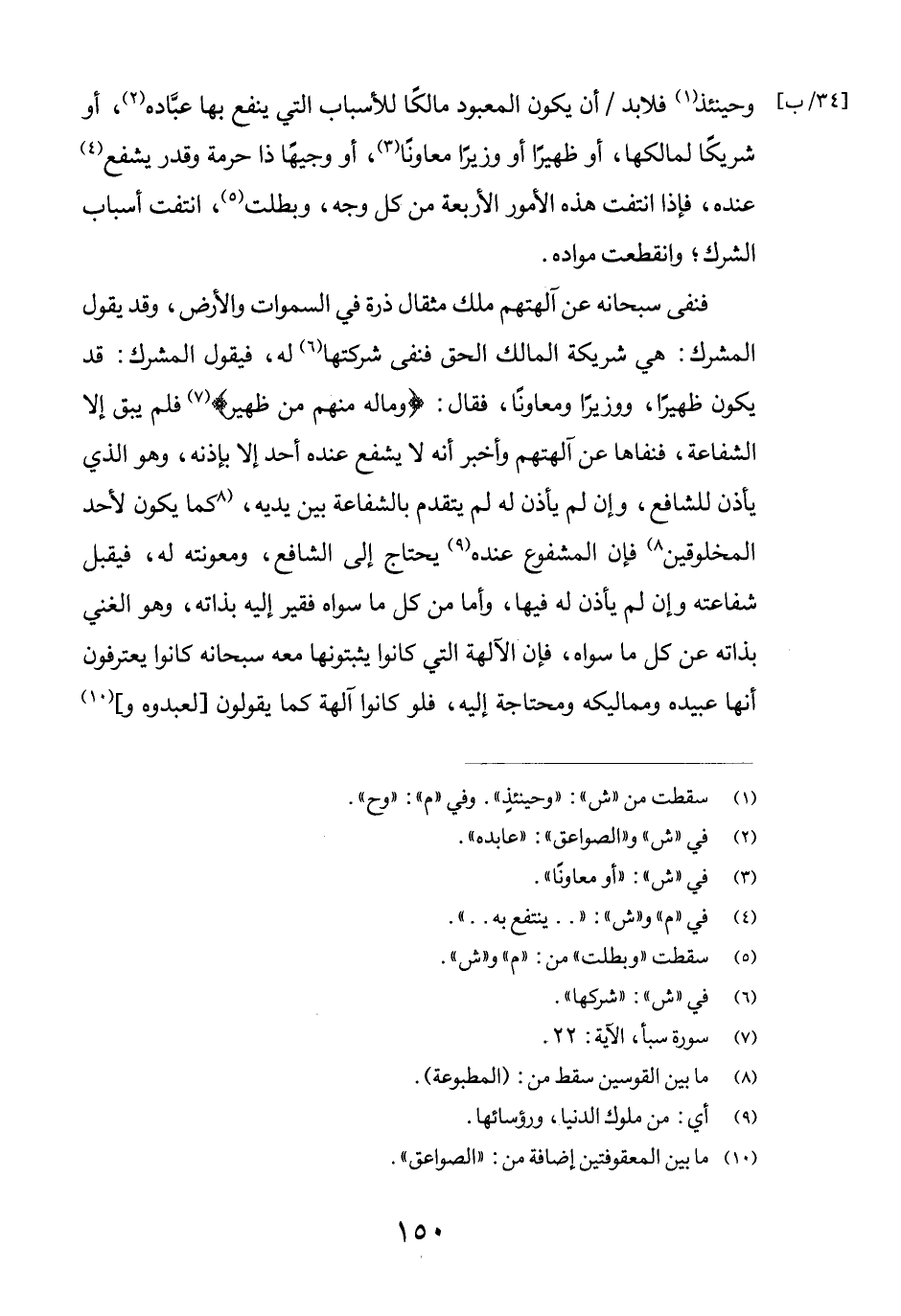 فنفى سبحانه عن آلهتهم ملك مثقال ذرة في السموات والأرض، وقد يقول المشرك: هي شريكة المالك الحق فنفى شركتها (6) له، فيقول المشرك: قد يكون ظهيراً، ووزيراً ومعاوناً، فقال: {وَمَا لَهُ مِنْهُمْ مِنْ ظَهِيرٍ} (7) فلم يبق إلا الشفاعة، فنفاها عن آلهتهم وأخبر أنه لا يشفع عنده أحد إلا بإذنه، وهو الذي يأذن للشافع، وإن لم يأذن له لم يتقدم بالشفاعة بين يديه، (8 كما يكون لأحد المخلوقين 8) (8) فإن المشفوع عنده (9) يحتاج إلى الشافع، ومعونته له، فيقبل شفاعته وإن لم يأذن له فيها، وأما من كل ما سواه فقير إليه بذاته، وهو الغني بذاته عن كل ما سواه، فإن الآلهة التي كانوا يثبتونها معه سبحانه كانوا يعترفون أنها عبيده ومماليكه ومحتاجة إليه، فلو كانوا آلهة كما يقولون [لعبدوه و] (10)