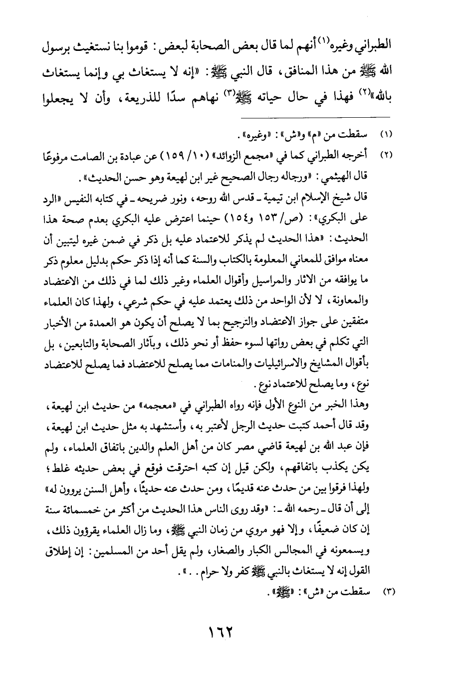 الطبراني وغيره (1) أنهم لما قال بعض الصحابة لبعض: قوموا بنا نستغيث برسول الله صلى الله عليه وسلم من هذا المنافق، قال صلى الله عليه وسلم: "إنه لا يستغاث بي وإنما يستغاث بالله" (2) فهذا في حال حياته (3) صلى الله عليه وسلم نهاهم سداً للذريعة، وأن لا يجعلوا