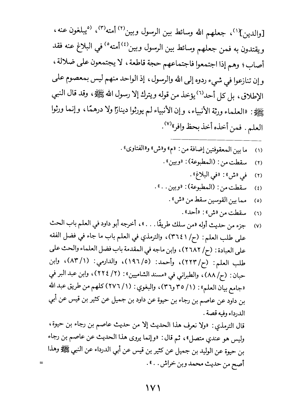 [والدين] (1) ، جعلهم الله وسائط بين الرسول وبين (2) أمته (3) ، يبلغون عنه، ويقتدون به فمن جعلهم وسائط بين الرسول وبين (4) أمته (5) في البلاغ عنه فقد أصاب؛ وهم إذا اجتمعوا فاجتماعهم حجة قاطعة، لا يجتمعون على ضلالة، وإن تنازعوا في شيء ردوه إلى الله والرسول، إذ الواحد منهم ليس بمعصوم على الإطلاق، بل كل أحد (6) يؤخذ من قوله ويترك إلا رسول الله صلى الله عليه وسلم، وقد قال النبي صلى الله عليه وسلم: "العلماء ورثة الأنبياء، وإن الأنبياء لم يورثوا ديناراً ولا درهماً، وإنما ورثوا العلم. فمن أخذه أخذ بحظ وافر" (7) .