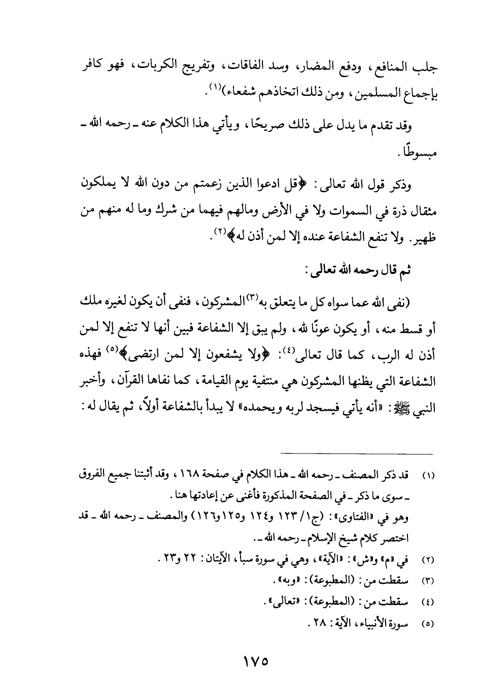 وذكر قول الله تعالى: {قُلِ ادْعُوا الَّذِينَ زَعَمْتُمْ مِنْ دُونِ اللَّهِ لا يَمْلِكُونَ مِثْقَالَ ذَرَّةٍ فِي السَّمَاوَاتِ وَلا فِي الْأَرْضِ وَمَا لَهُمْ فِيهِمَا مِنْ شِرْكٍ وَمَا لَهُ مِنْهُمْ مِنْ ظَهِيرٍ، وَلا تَنْفَعُ الشَّفَاعَةُ عِنْدَهُ إِلَّا لِمَنْ أَذِنَ لَه} (2) . ثم قال رحمه الله تعالى: (نفى الله عما سواه كل ما يتعلق به (3) المشركون، فنفى أن يكون لغيره ملك أو قسط منه، أو يكون عوناً لله، ولم يبق إلا الشفاعة فبين أنها لا تنفع إلا لمن أذن له الرب، كما قال تعالى (4) : {وَلا يَشْفَعُونَ إِلَّا لِمَنِ ارْتَضَى} (5) فهذه الشفاعة التي يظنها المشركون هي منتفية يوم القيامة، كما نفاها القرآن، وأخبر النبي صلى الله عليه وسلم: "أنه يأتي فيسجد لربه ويحمده" لا يبدأ بالشفاعة أولاً، ثم يقال له: