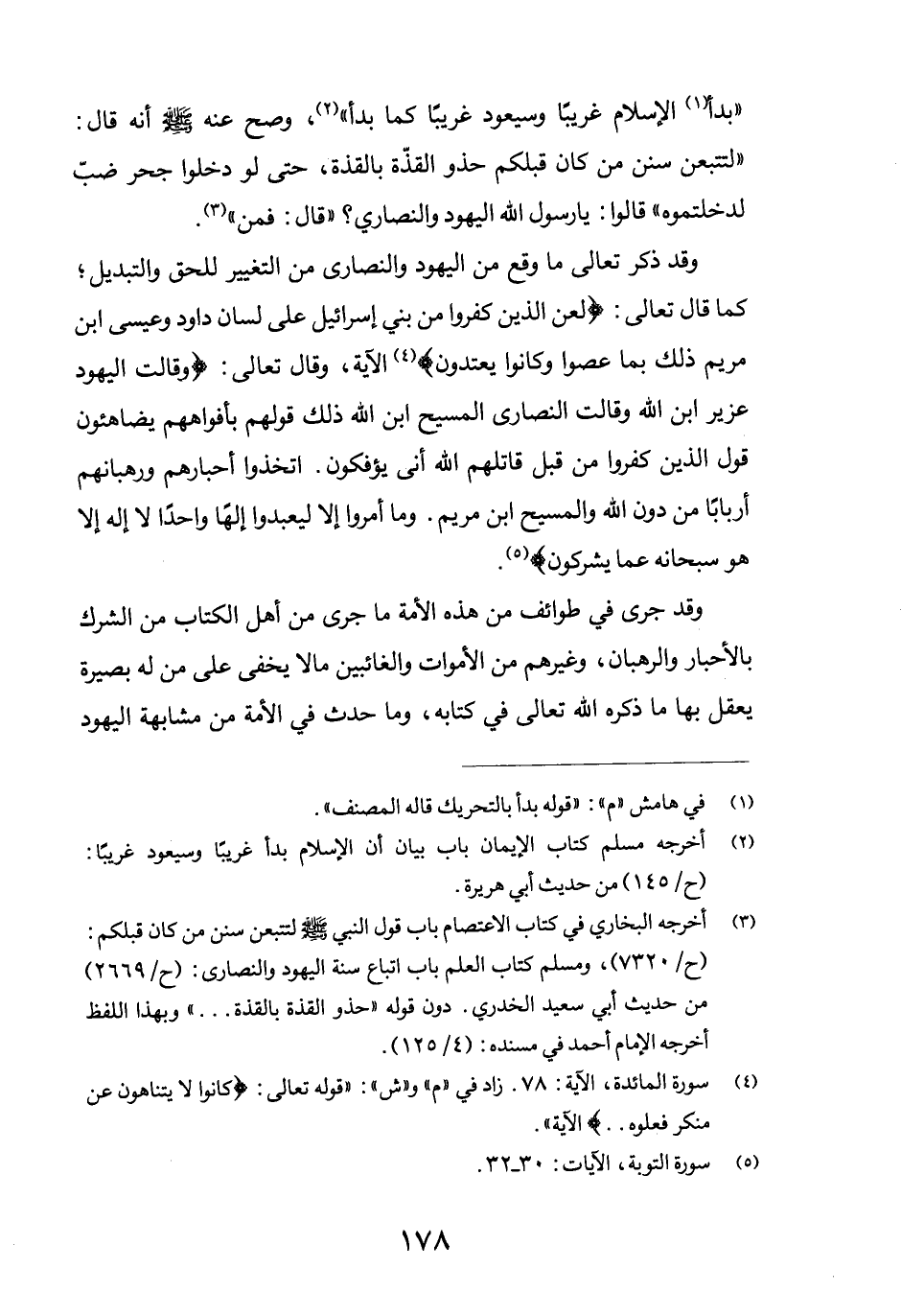 "بدأ (1) الإسلام غريباً وسيعود غريباً كما بدأ" (2) ، وصح عنه صلى الله عليه وسلم أنه قال: "لتتبعن سنن من كان قبلكم حذو القذّة بالقذّة، حتى لو دخلوا جحر ضبّ لدخلتموه" قالوا: يا رسول الله اليهود والنصارى؟ "قال: فمن" (3) .