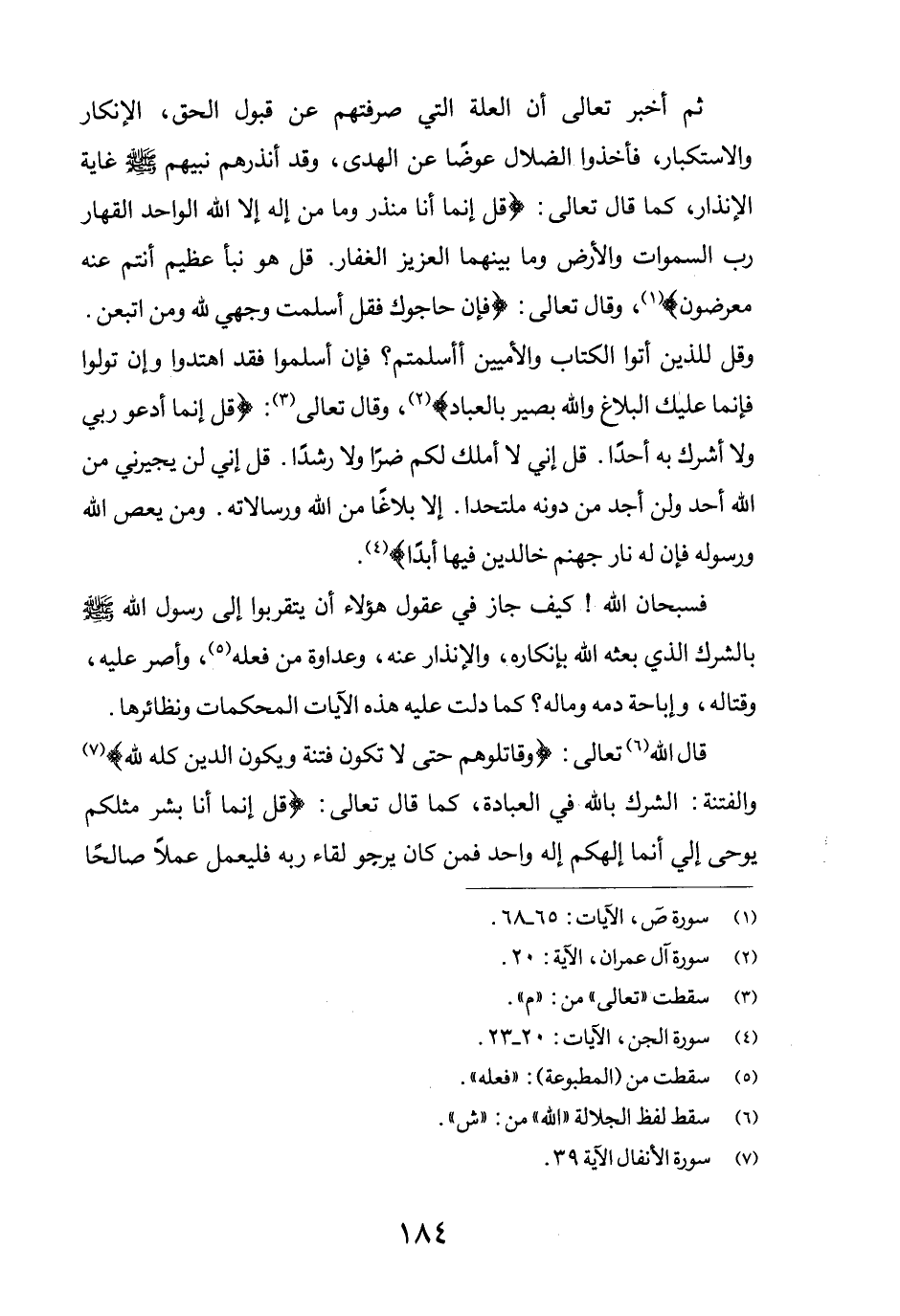 قال الله (5) تعالى: {وَقَاتِلُوهُمْ حَتَّى لا تَكُونَ فِتْنَةٌ وَيَكُونَ الدِّينُ كُلُّهُ لِلَّه} (6) والفتنة: الشرك بالله في العبادة، كما قال تعالى: {قُلْ إِنَّمَا أَنَا بَشَرٌ مِثْلُكُمْ يُوحَى إِلَيَّ أَنَّمَا إِلَهُكُمْ إِلَهٌ وَاحِدٌ فَمَنْ كَانَ يَرْجُوا لِقَاءَ رَبِّهِ فَلْيَعْمَلْ عَمَلاً صَالِحا