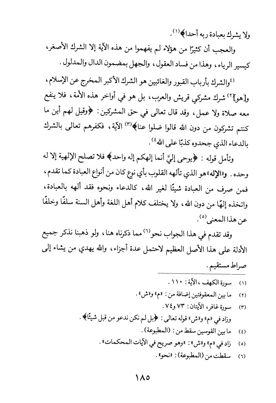 وَلا يُشْرِكْ بِعِبَادَةِ رَبِّهِ أَحَدا} (1) . والعجب أن كثيراً من هؤلاء لم يفهموا من هذه الآية إلا الشرك الأصغر، كيسير الرياء، وهذا من فساد العقول، والجهل بمضمون الدال والمدلول.