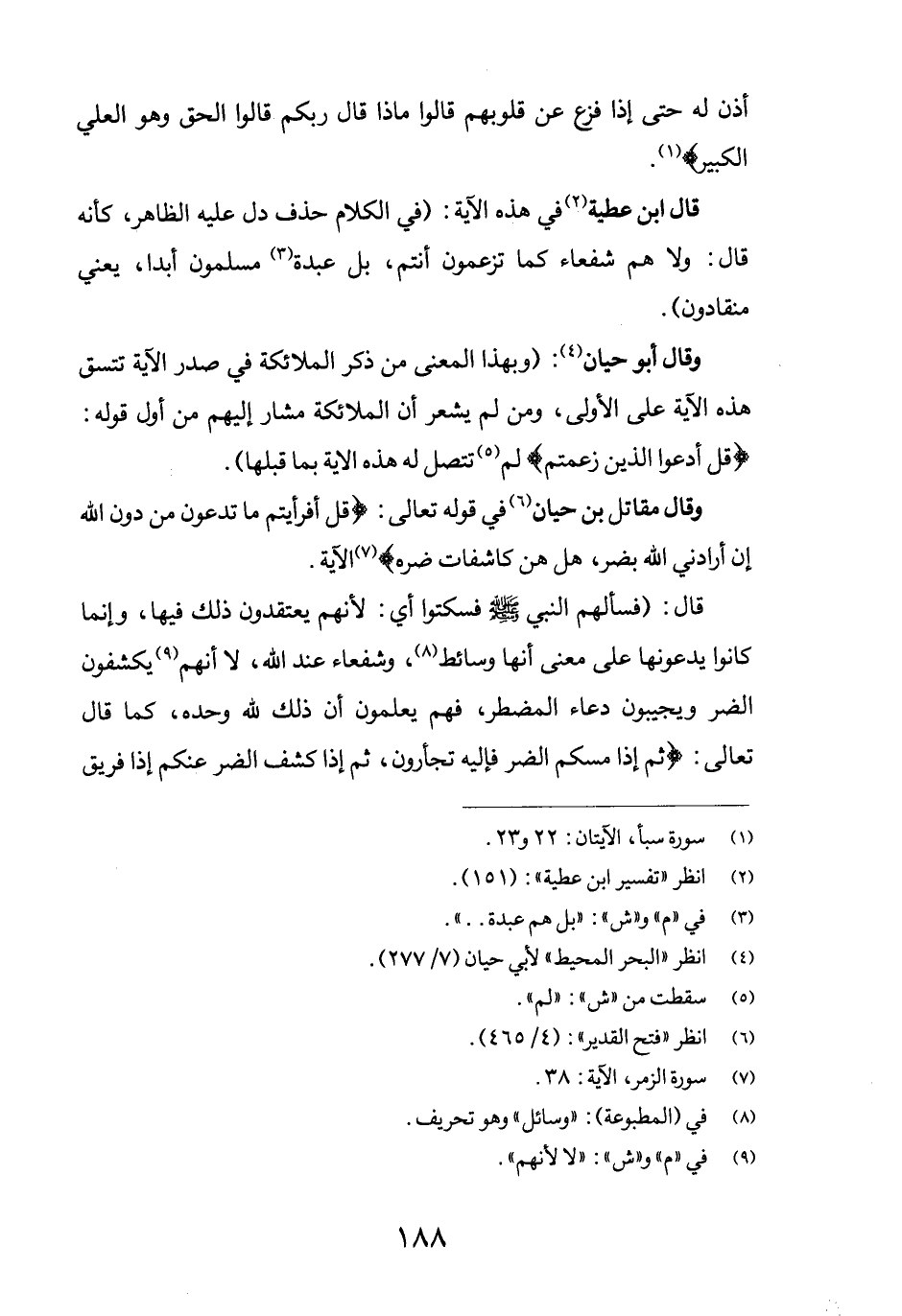 قال ابن عطية (2) في هذه الآية: (في الكلام حذف دل عليه الظاهر، كأنه قال: ولا هم شفعاء كما تزعمون أنتم، بل عبدة (3) مسلمون أبدا، يعنى منقادون) .