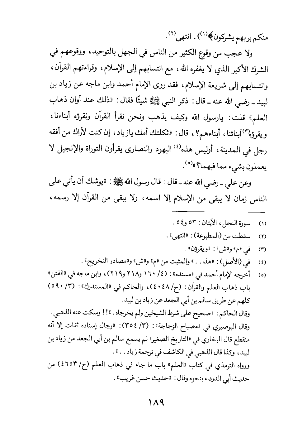 (5) أخرجه الإمام أحمد في "مسنده": (4/160و 218و 219) ، وابن ماجه في "الفتن" باب ذهاب العلم والقرآن: (ح/4048) ، والحاكم في "المستدرك": (3/590) كلهم عن طريق سالم بن أبي الجعد عن زياد بن لبيد.
