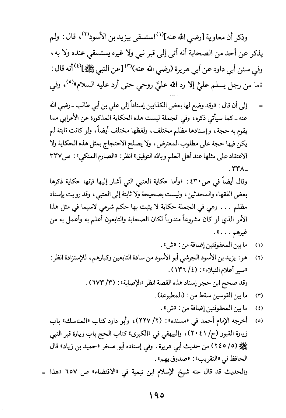 وذكر أن معاوية [رضي الله عنه] (1) استسقى بيزيد بن الأسود (2) ، قال: ولم يذكر عن أحد من الصحابة أنه أتى إلى قبر نبي ولا غيره يستسقي عنده ولا به، وفي سنن أبي داود عن أبي هريرة (رضي الله عنه) (3) [عن النبي صلى الله عليه وسلم] (4) أنه قال: "ما من رجل يسلم علىَّ إلا رد الله عليَّ روحي حتى أرد عليه السلام" (5) ، وفي