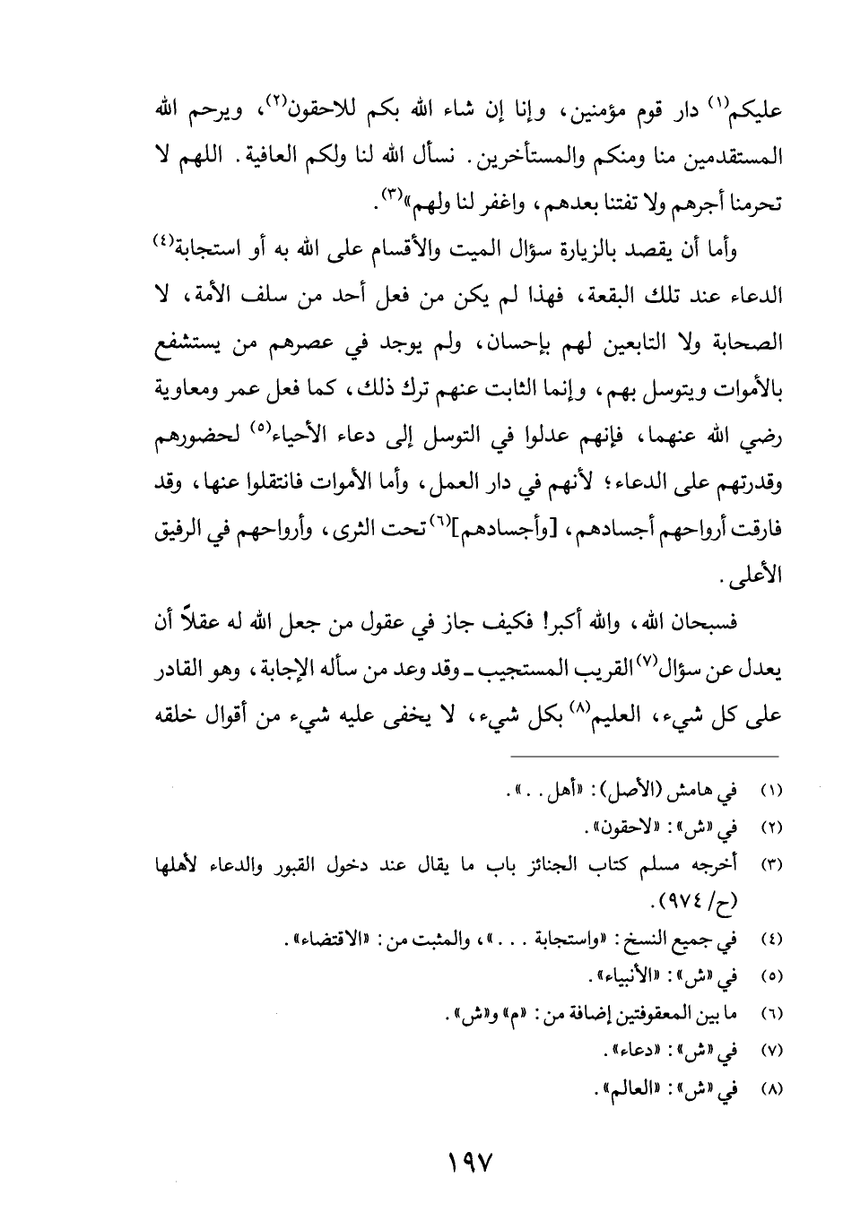 عليكم (1) دار قوم مؤمنين، وإنا إن شاء الله بكم للاحقون (2) ، ويرحم الله المستقدمين منا ومنكم والمستأخرين. نسأل الله لنا ولكم العافية. اللهم لا تحرمنا أجرهم ولا تفتنا بعدهم، واغفر لنا ولهم" (3) .