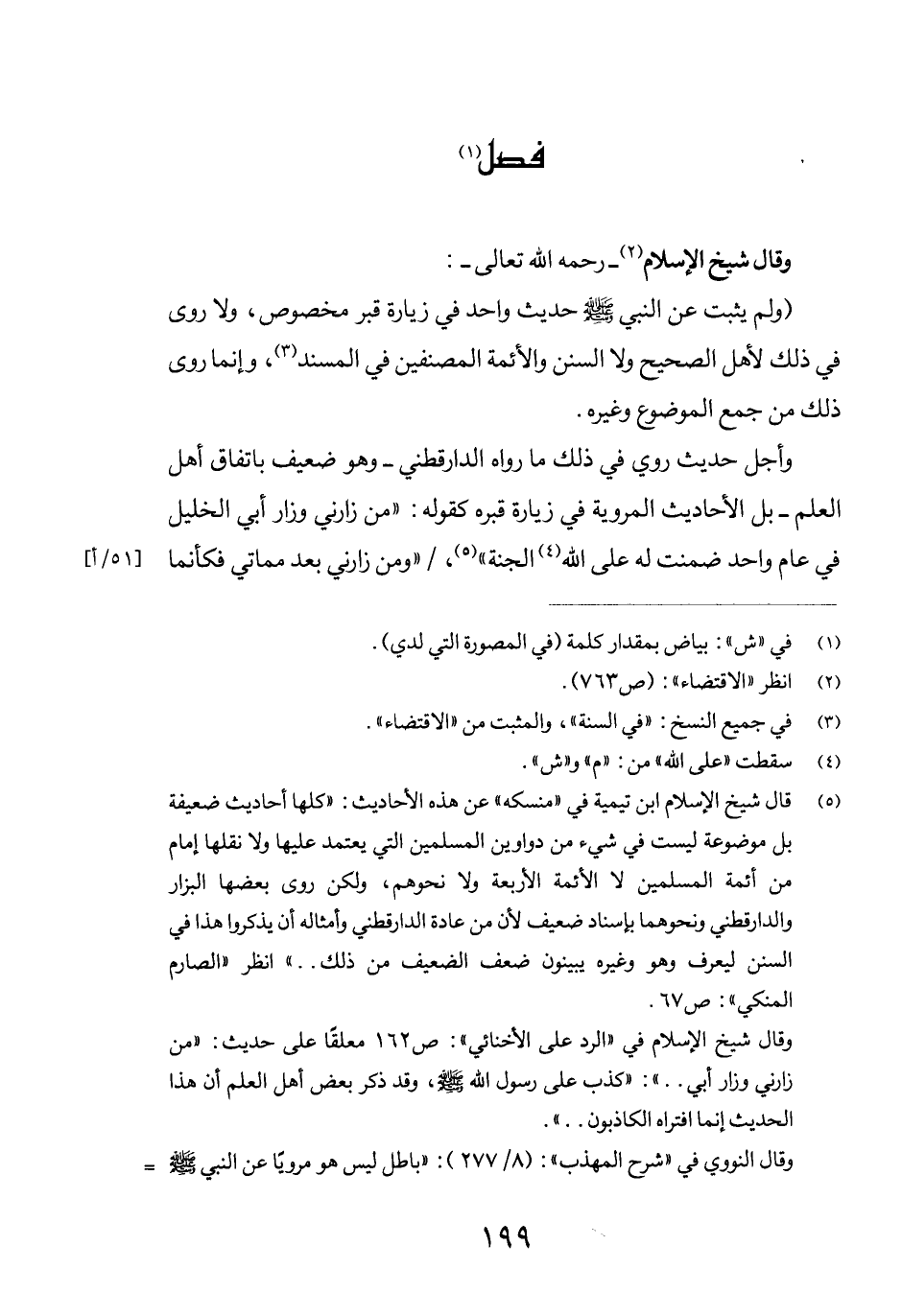 (5) قال شيخ الإسلام ابن تيمية في "منسكه" عن هذه الأحاديث: "كلها أحاديث ضعيفة بل موضوعة ليست في شيء من دواوين المسلمين التي يعتمد عليها ولا نقلها إمام من أئمة المسلمين لا الأئمة الأربعة ولا نحوهم، ولكن روى بعضها البزار والدارقطني ونحوهما بإسناد ضعيف لأن من عادة الدارقطني وأمثاله أن يذكروا هذا في السنن ليعرف وهو وغيره يبينون ضعف الضعيف من ذلك.."انظر "الصارم المنكي"ص 67.
