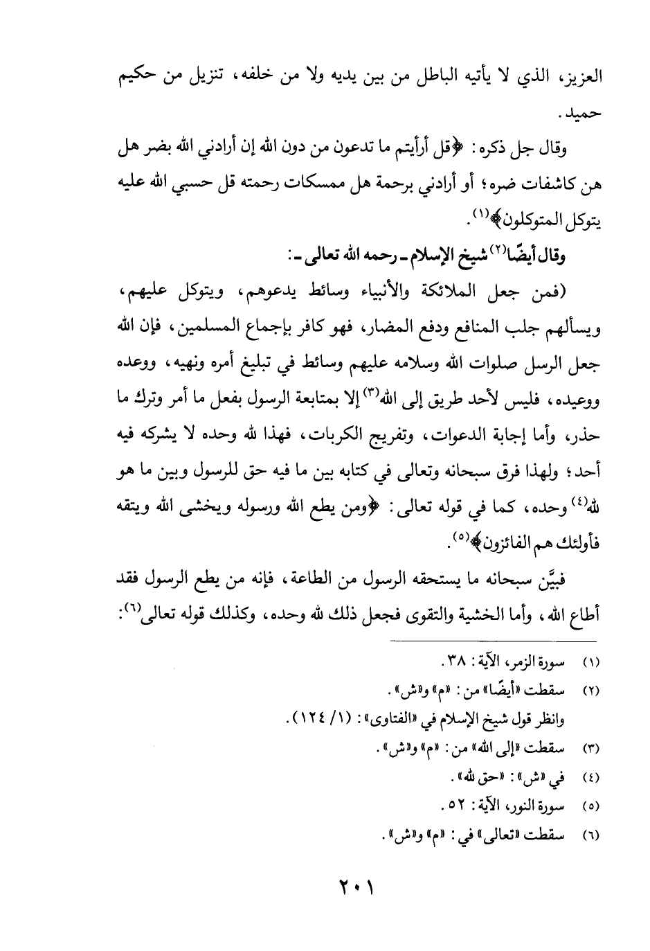 وقال جل ذكره: {قُلْ أَفَرَأَيْتُمْ مَا تَدْعُونَ مِنْ دُونِ اللَّهِ إِنْ أَرَادَنِيَ اللَّهُ بِضُرٍّ هَلْ هُنَّ كَاشِفَاتُ ضُرِّهِ أَوْ أَرَادَنِي بِرَحْمَةٍ هَلْ هُنَّ مُمْسِكَاتُ رَحْمَتِهِ قُلْ حَسْبِيَ اللَّهُ عَلَيْهِ يَتَوَكَّلُ الْمُتَوَكِّلُون} (1) .