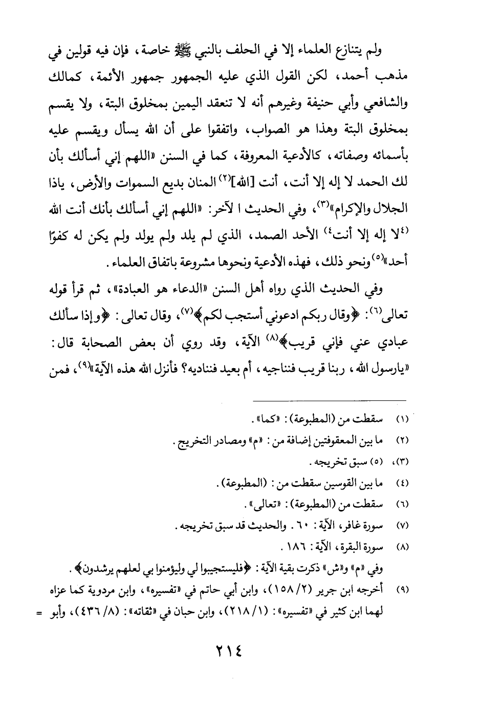 ولم يتنازع العلماء إلا في الحلف بالنبي صلى الله عليه وسلم خاصة، فإن فيه قولين في مذهب أحمد، لكن القول الذي عليه الجمهور جمهور الأئمة، كمالك والشافعي وأبي حنيفة وغيرهم أنه لا تنعقد اليمين بمخلوق البتة، ولا يقسم بمخلوق البتة وهذا هو الصواب، واتفقوا على أن الله يسأل ويقسم عليه بأسمائه وصفاته، كالأدعية المعروفة، كما (1) في السنن " اللهم إني أسألك بأن لك الحمد لا إله إلا أنت، أنت [الله] (2) المنان بديع السموات والأرض، يا ذا الجلال والإكرام" (3) ، وفي الحديث الآخر: "اللهم إني أسألك بأنك أنت الله (4 لا إله إلا أنت4) (4) الأحد الصمد، الذي لم يلد ولم يولد ولم يكن له كفواً أحد" (5) ونحو ذلك، فهذه الأدعية ونحوها مشروعة باتفاق العلماء.