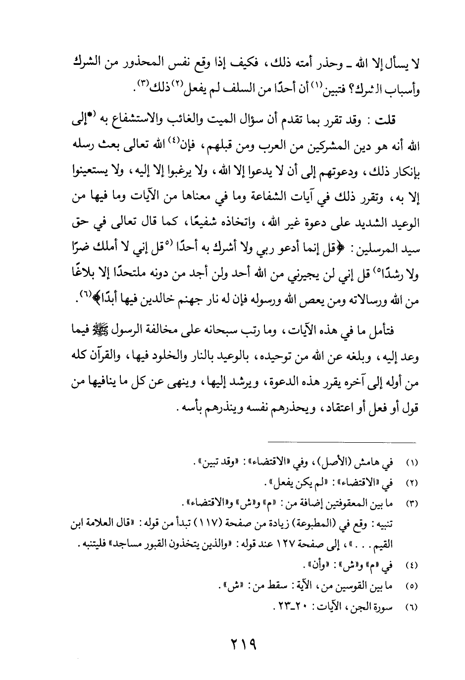 قلت: وقد تقرر بما تقدم أن سؤال الميت والغائب والاستشفاع به إلى الله أنه هو دين المشركين من العرب ومن قبلهم، فإن (4) الله تعالى بعث رسله إلا به، وتقرر ذلك في آيات الشفاعة وما في معناها من الآيات وما فيها من سيد المرسلين: {قُلْ إِنَّمَا أَدْعُو رَبِّي وَلا أُشْرِكُ بِهِ أَحَداً. (5 قُلْ إِنِّي لا أَمْلِكُ لَكُمْ ضَرّاً وَلا رَشَداً5) (5) . قُلْ إِنِّي لَنْ يُجِيرَنِي مِنَ اللَّهِ أَحَدٌ وَلَنْ أَجِدَ مِنْ دُونِهِ مُلْتَحَداً. إِلَّا بَلاغاً مِنَ اللَّهِ وَرِسَالاتِهِ وَمَنْ يَعْصِ اللَّهَ وَرَسُولَهُ فَإِنَّ لَهُ نَارَ جَهَنَّمَ خَالِدِينَ فِيهَا أَبَدا} (6) .