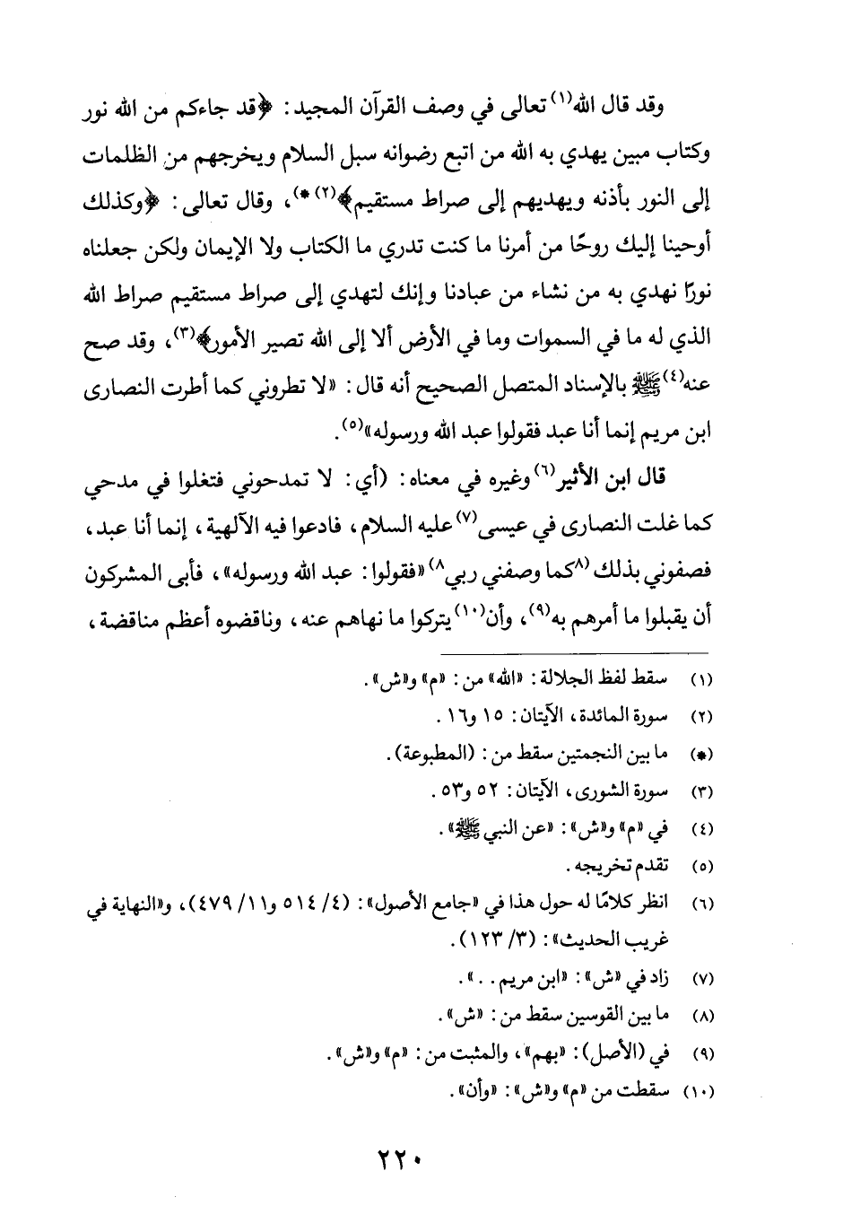 وقد قال الله (1) تعالى في وصف القرآن المجيد: {قَدْ جَاءَكُمْ مِنَ اللَّهِ نُورٌ كِتَابٌ مُبِينٌ يَهْدِي بِهِ اللَّهُ مَنِ اتَّبَعَ رِضْوَانَهُ سُبُلَ السَّلامِ وَيُخْرِجُهُمْ مِنَ الظُّلُمَاتِ إِلَى النُّورِ بِإِذْنِهِ وَيَهْدِيهِمْ إِلَى صِرَاطٍ مُسْتَقِيم} (2) *) ، وقال تعالى: {وَكَذَلِكَ أَوْحَيْنَا إِلَيْكَ رُوحاً مِنْ أَمْرِنَا مَا كُنْتَ تَدْرِي مَا الْكِتَابُ وَلا الْأِيمَانُ وَلَكِنْ جَعَلْنَاهُ نُوراً نَهْدِي بِهِ مَنْ نَشَاءُ مِنْ عِبَادِنَا وَإِنَّكَ لَتَهْدِي إِلَى صِرَاطٍ مُسْتَقِيمٍ. صِرَاطِ اللَّهِ الَّذِي لَهُ مَا فِي السَّمَاوَاتِ وَمَا فِي الْأَرْضِ أَلا إِلَى اللَّهِ تَصِير الْأُمُور} (3) ، وقد صح عنه (4) صلى الله عليه وسلم بالإسناد المتصل الصحيح أنه قال: "لا تطروني كما أطرت النصارى ابن مريم إنما أنا عبد فقولوا عبد الله ورسوله" (5) .